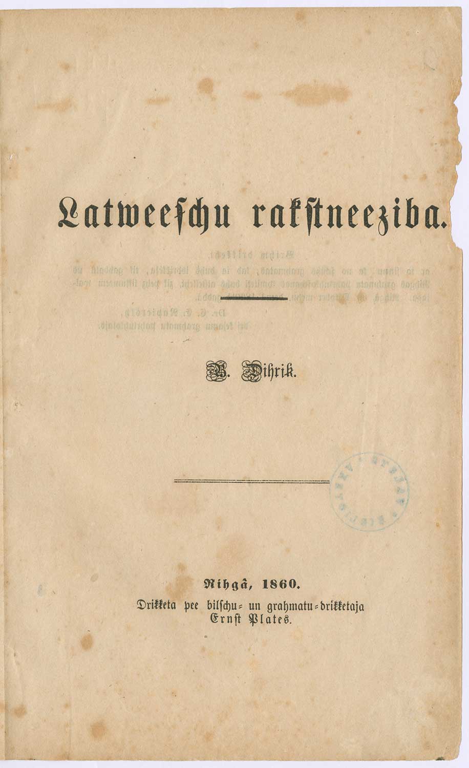 Bernharda Dīriķa grāmata “Latviešu rakstniecība”, Rīga, izdevējs Ernsts Plātess, 1860. gads.