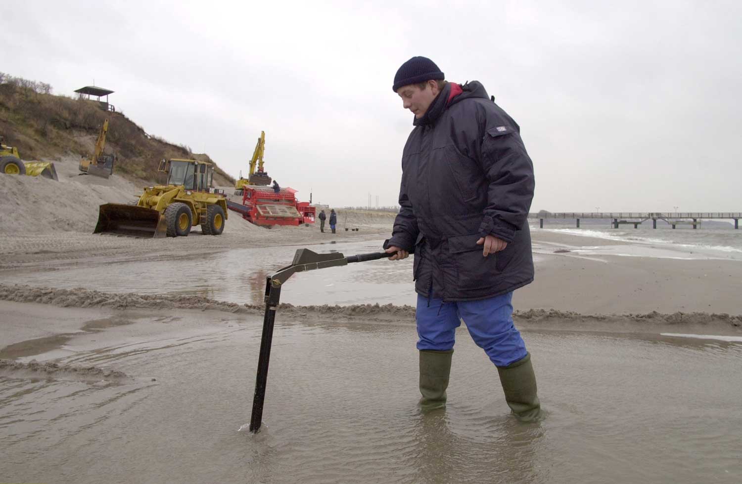 Baltijas jūras piekrastes pilsētas Rērikas pludmalē ar speciālas ierīces palīdzību tiek meklētas Otrā pasaules kara munīcijas atliekas. Vācija, 08.02.2000.