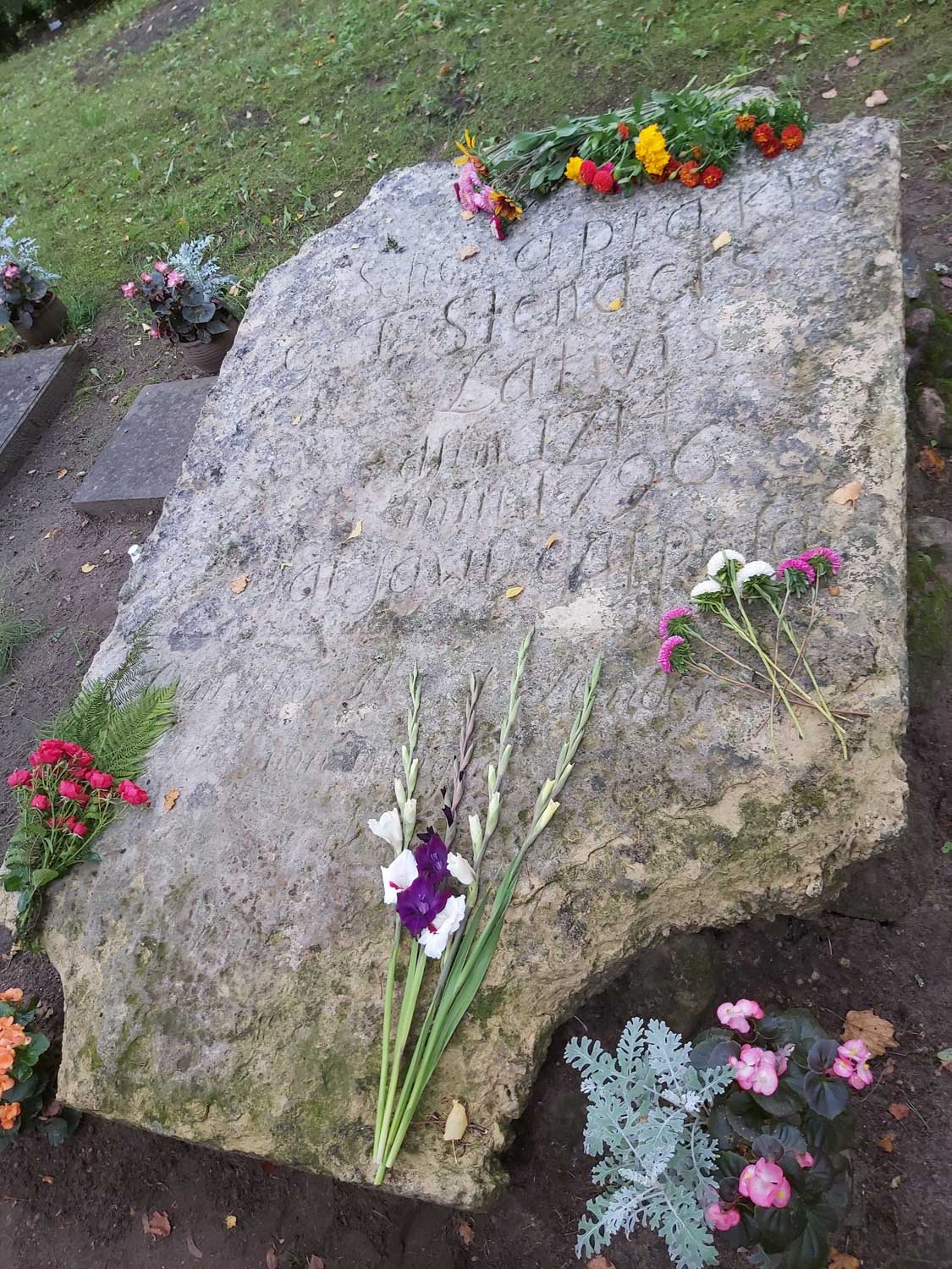 A. J. Stenders apglabāts līdzās tēva kapavietai Sunākstes kapsētā. 2018. gadā Stendera biedrība uzstādīja piemiņas plāksni pie kapavietas.