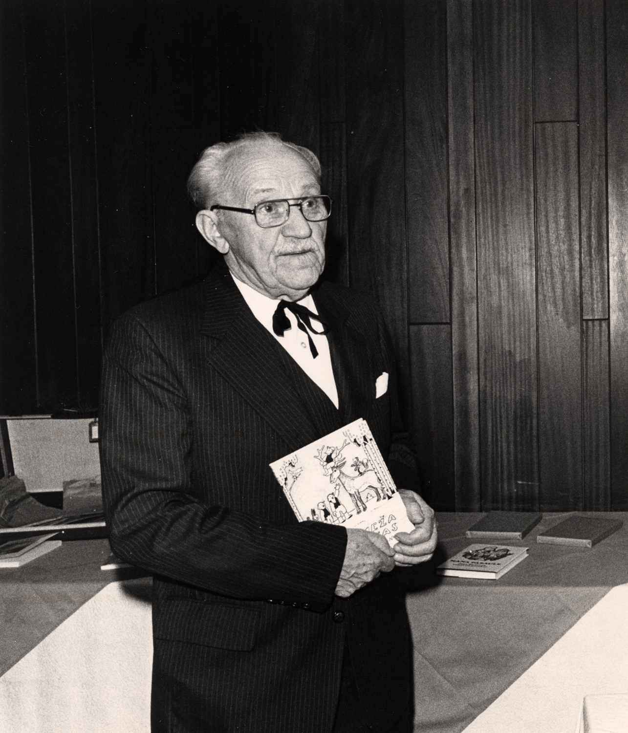 Jānis Širmanis ar grāmatu "Lielmeža pasakas". 20. gs. 80. gadu sākums.