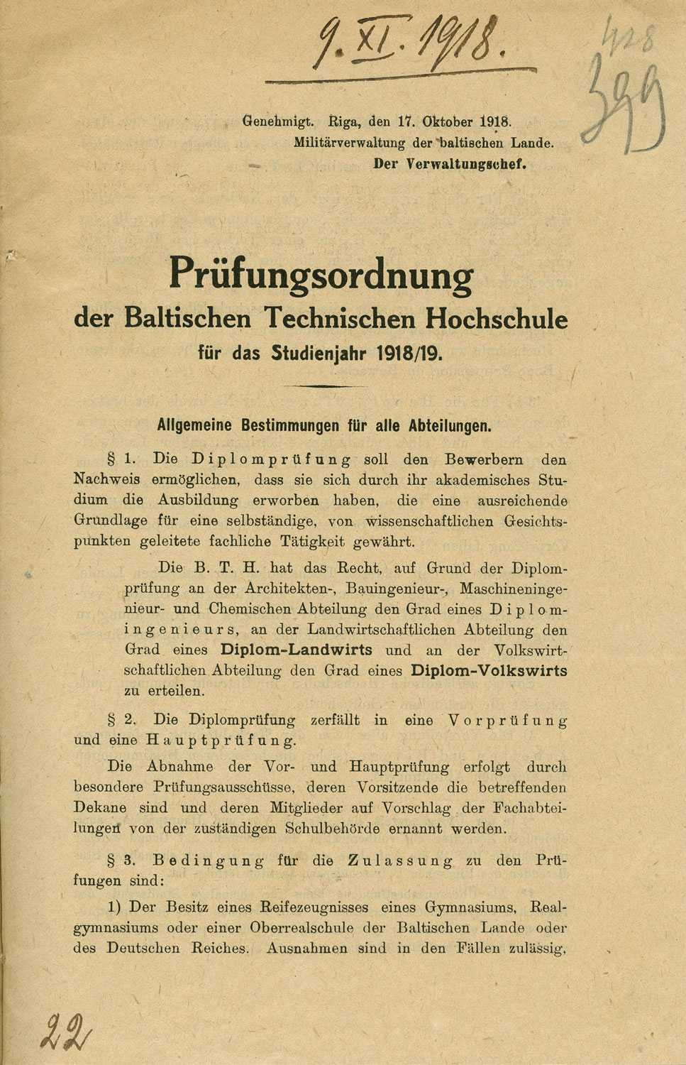 Augstskolā varēja iestāties jaunieši ar ģimnāzijas, reālģimnāzijas vai vidusskolas diplomu, kas iegūts Baltijas provincēs vai Vācu Impērijā. Par ārzemnieku studentu uzņemšanu bija tiesīga lemt tikai Baltijas militārā pārvalde. BTA bija pirmā augstskola Latvijas teritorijā, kurā uzņēma arī sievietes. 19.10.1918. augstskolā bija uzņemti 904 jaunieši, no tiem 42 % turpināja RPI pārtrauktās studijas, 43 % bija jaunuzņemtie studenti, 15 % bija uzņemti kā hospitanti. Studijas BTA atjaunoja un uzsāka arī liels skaits latviešu tautības studentu. Kopumā augstskolā trīs mēnešu laikā studijas uzsāka aptuveni 1500 jauniešu. No tiem 547 bija jaunuzņemtie studenti, kā arī 231 hospitants. Vairākums turpināja RPI iesāktās studijas. No jaunuzņemtajiem studentiem 155 mācības uzsāka Mehānikas, 116 – Ķīmijas, 101 – Inženieru, 75 – Tirdzniecības, 60 – Lauksamniecības un 40 – Arhitektūras nodaļā. Hospitantiem bija tiesības klausīties lekcijas, piedalīties praktiskajās nodarbībās un kārtot eksāmenus, bet, lai kļūtu par pilntiesīgiem studentiem, viņiem bija jānokārto hospitantu pārbaudījumi. Arhitektūras nodaļā tika uzņemti 16, Inženieru nodaļā – 22, Ķīmijas nodaļā – 49, Tirdzniecības nodaļā – 81, Lauksaimniecības nodaļā – 21, Mehānikas nodaļā – 42 hospitanti. Atjaunojot augstskolu kā RTA pēc lielinieku atkāpšanās no Rīgas, 06.1919. papildus tika uzņemti 48 studenti. Lai nodrošinātu lielāku studējošo skaitu, tika uzņemti arī brīvklausītāji.