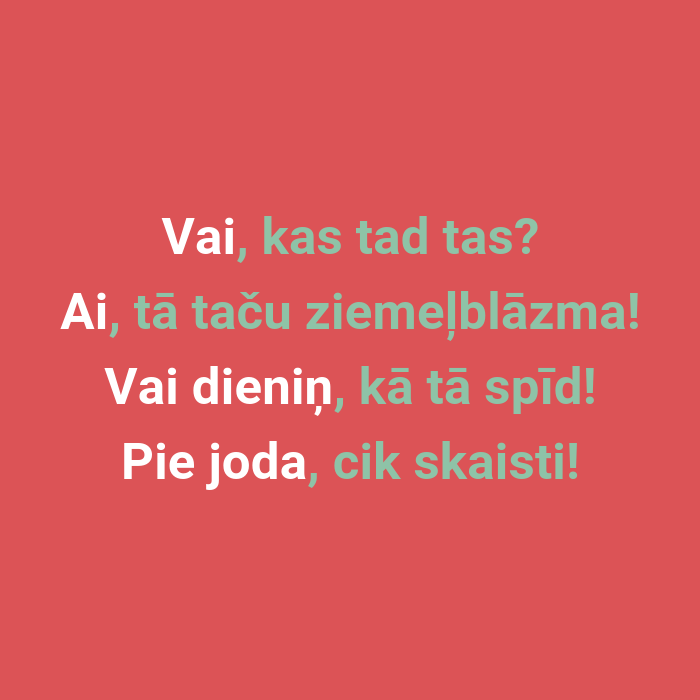 4) izsauksmes vārdi, kas atdarina dabas skaņas jeb onomatopoētismi – Zēns nošķaudījās, apčī!; Čiv, čiv, čiv, mazie putniņi sasaucās; Zars – krakš – un uz pusēm bija!