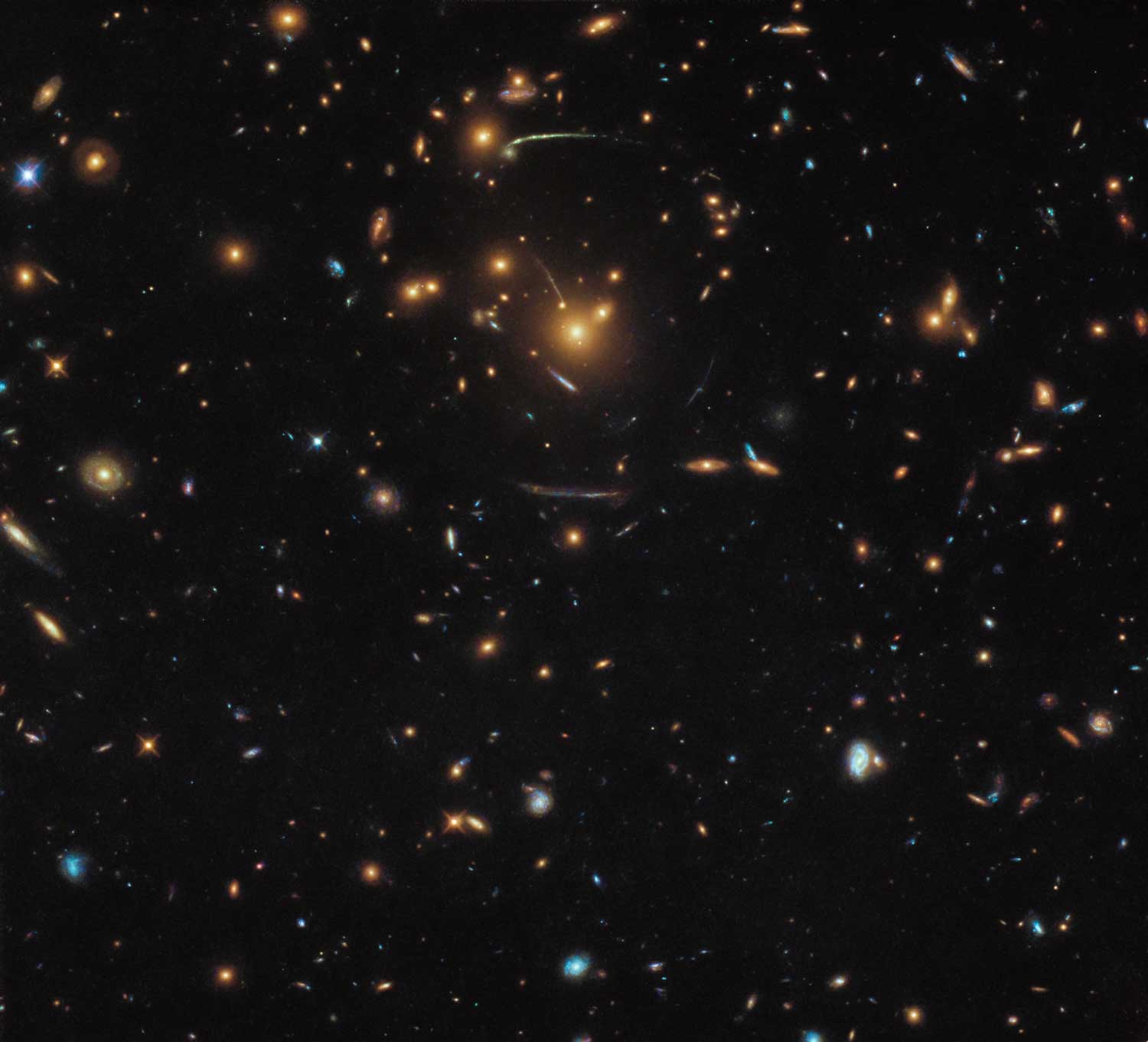Galaktikas dažādās Visuma evolucionārās stadijās un attālumos no Zemes. Habla kosmiskā teleskopa uzņēmums, 2018. gads. Daļa no priekšplāna galaktikām pieder vienai gravitatīvi saistītai struktūrai - galaktiku kopai SDSS J1050+0017. Šīs galaktiku kopas matērija veido gravitācijas lēcu. Šāda lēca ļauj labāk saskatīt tālās galaktikas, kuru gaisma, ejot cauri galaktiku kopai, tiek optiski noliekta, izveidojot debesīs saskatāmas raksturīgas arkveida formas.