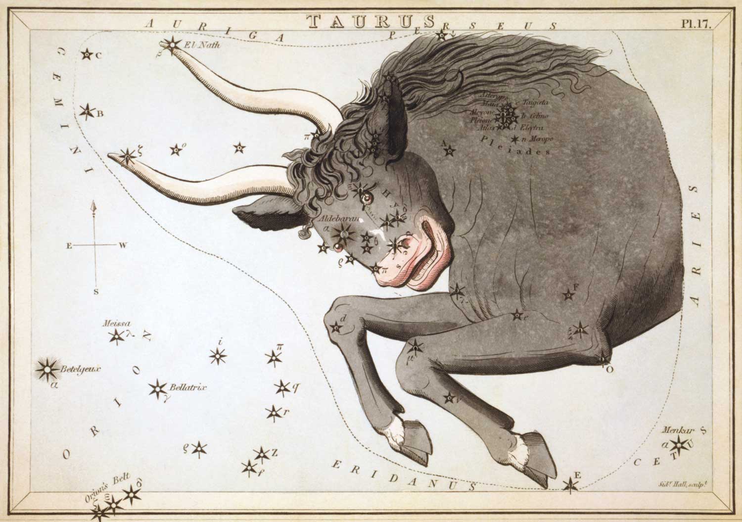 Vērša zvaigznāja attēlojums atlantā “Urānijas spogulis jeb Skats uz Debesīm” (Urania’s mirror, or, A view of the Heavens, Londona, 1824).