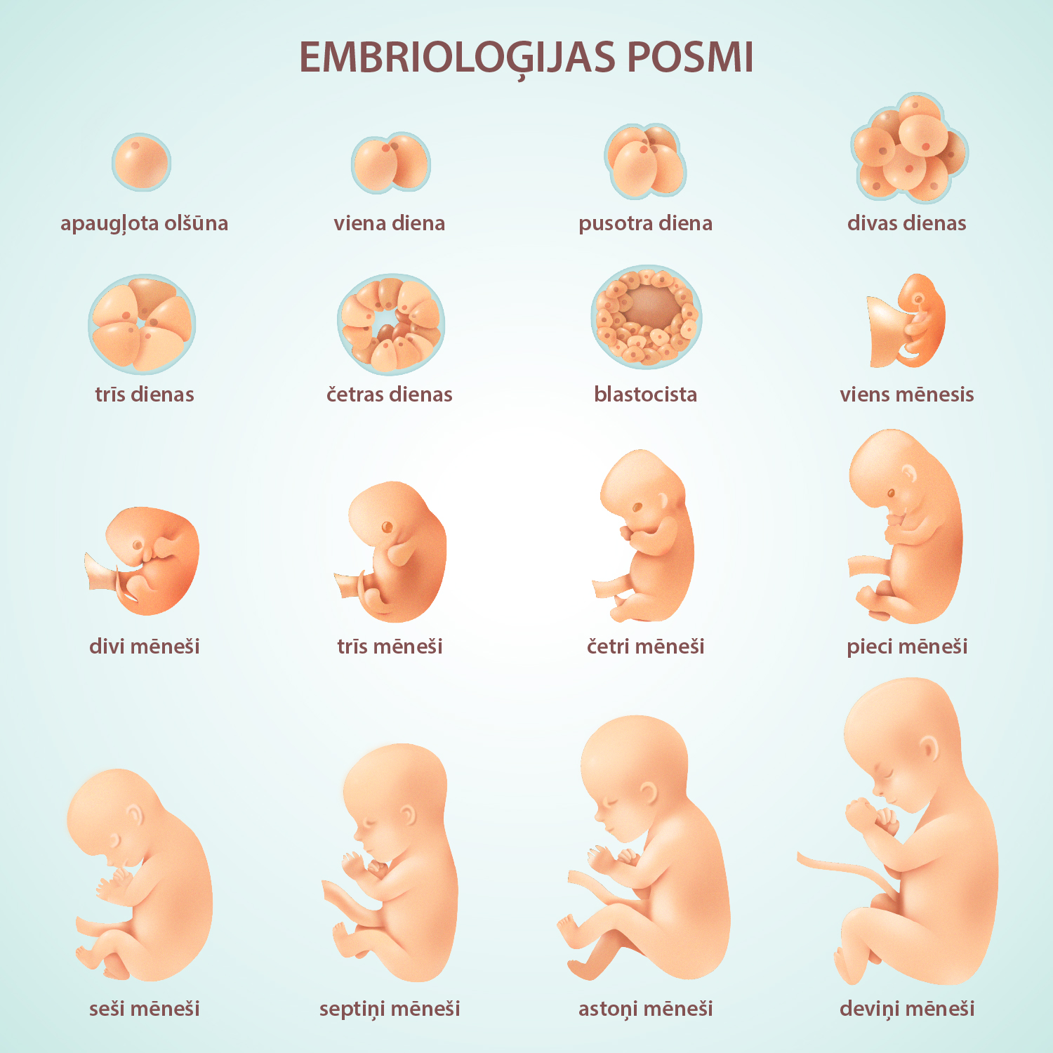 Atsevišķi embrioloģenēzes posmi ir: gametoģenēze, blastoģenēze, embrioģenēze, fetoģenēze. Kopā šie posmi nosedz grūtniecības 40 nedēļas vai trīs trimestrus. Pirmais posms ir ārpusdzemdes, bet pārējie – intrauterīnie posmi. Ar gametoģenēzi saprot vīrišķo un sievišķo dzimumšūnu, ietverot priekšteču šūnas, attīstību un nobriešanu; tā attiecas uz proģenēzes periodu. Blastoģenēze sākas pēc apaugļošanās un noslēdzas līdz 15. attīstības dienai. Šinī laikā veidojas dīglis ar divām lapiņām – epiblastu un hipoblastu, kā arī attīstās ārpusdīgļa (ekstraembrionālās) struktūras. Dīgļa barošanās ir histotrofa. Cilvēka embrioģenēze noris no 16. līdz vidēji 60. attīstības dienai. Šinī periodā veidojas orgānu aizmetņi, dīgļa apvalki un placenta. Šinī laikā dīgli sauc par