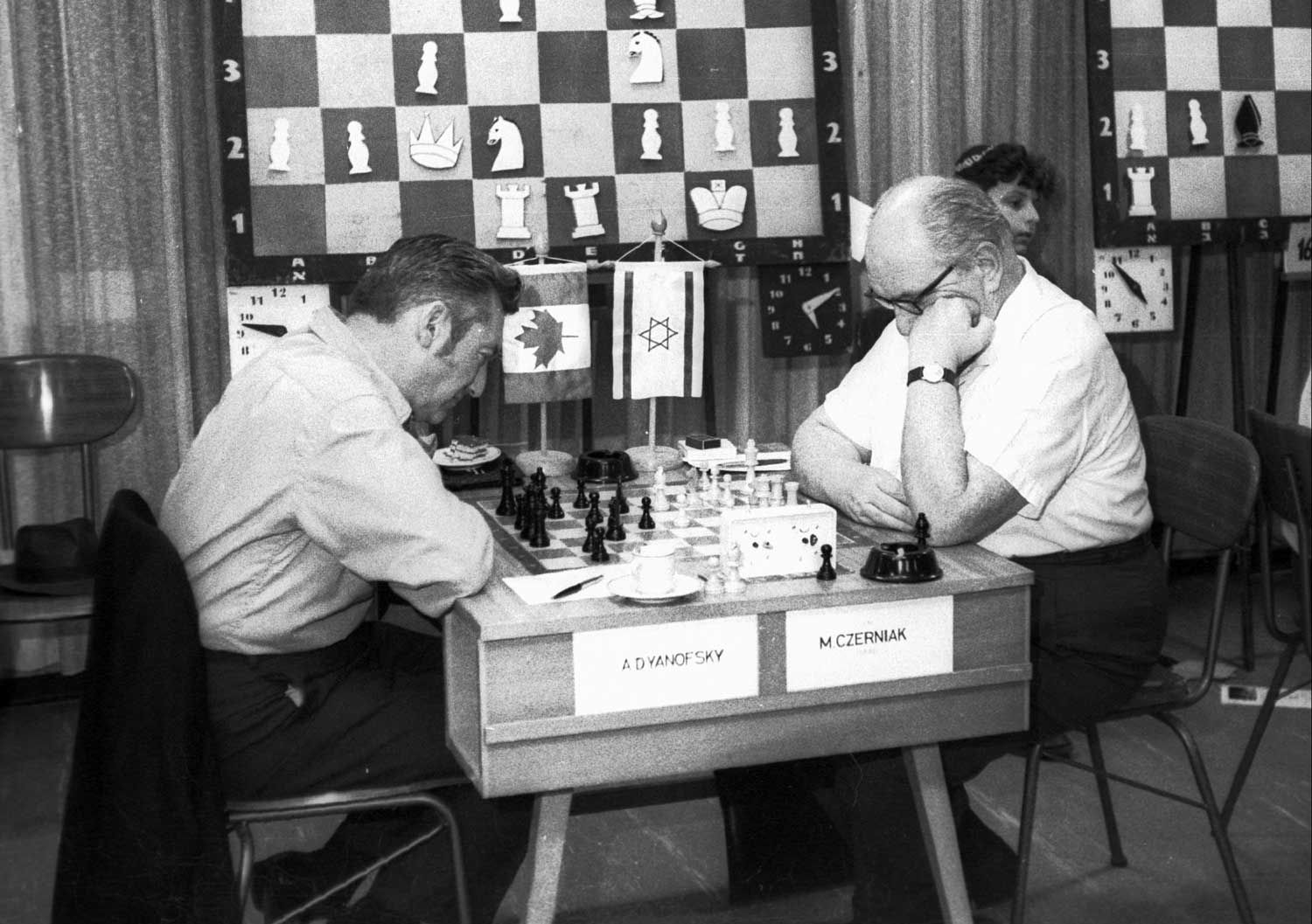 Izraēlas starptautiskais šaha meistars Moše Čerņaks (משה צ'רניאק‎) spēlē šahu ar Kanādas starptautisko šaha lielmeistaru Danielu Janofski (Daniel Abraham Yanofsky). Izraēla, 1969. gads.