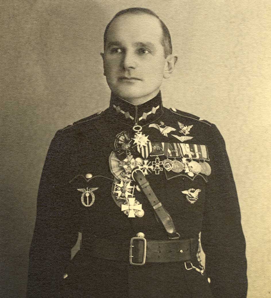Pulkvedis Jānis Indāns pie Starptautiskās aviatoru līgas balvas. 1934. gads.