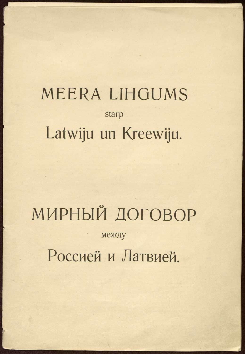 Latvijas un Krievijas miera līguma titullapa. Maskava, 11.08.1920.