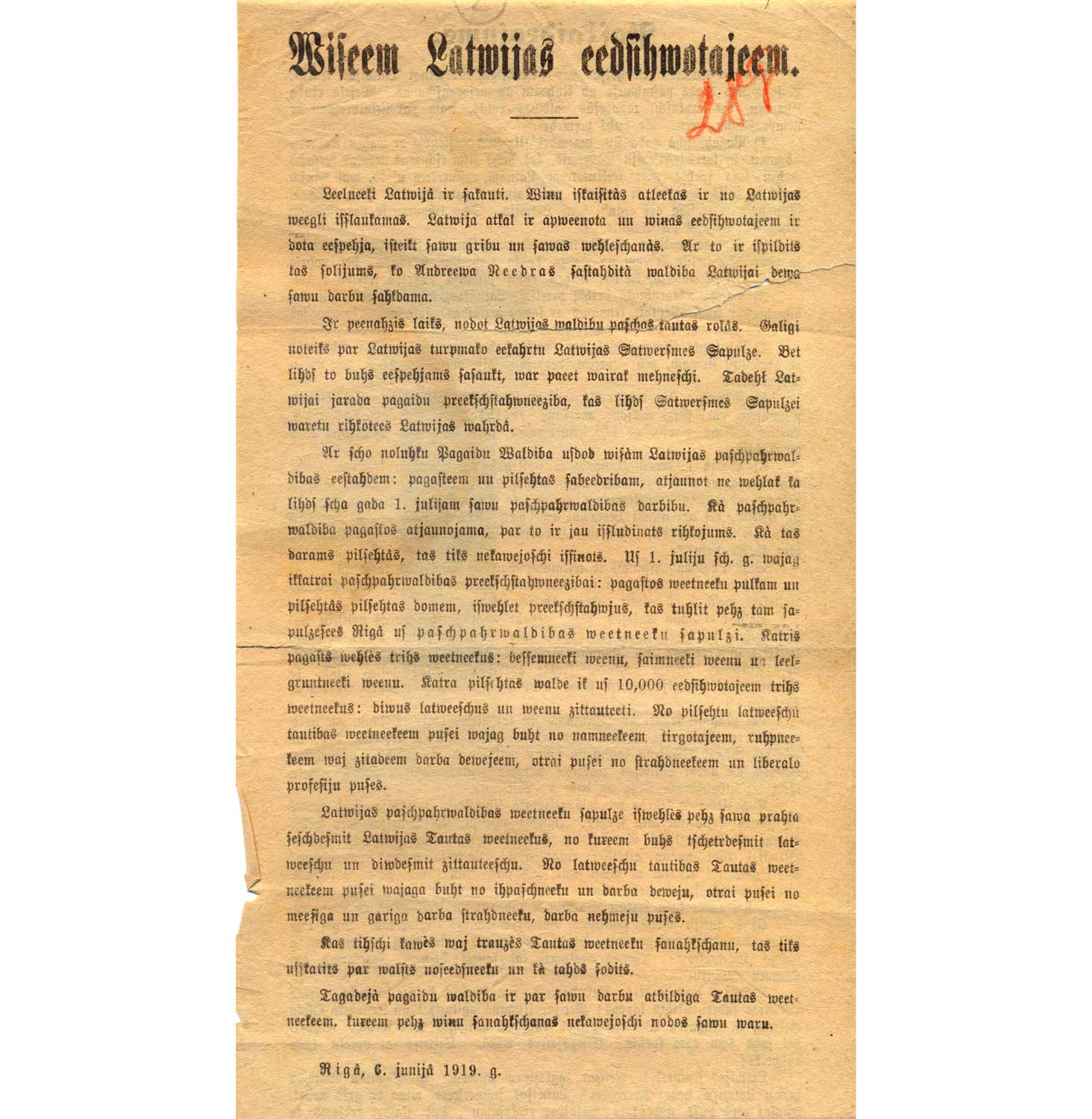 Andrieva Niedras uzsaukums "Visiem Latvijas iedzīvotājiem". Rīga, 06.06.1919.