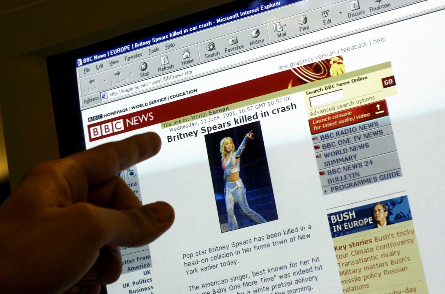 Viltus vietne BBC News, kas vēsta par popdziedātājas Britnijas Spīrsas (Britney Jean Spears) nāvi. Londona, Anglija, 13.06.2001.