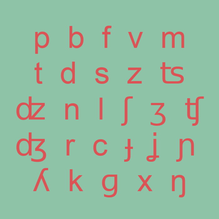 Līdzskaņu pāros pa labi ir norādīts balsīgs, bet pa kreisi – nebalsīgs līdzskanis. Ar pelēku atzīmētās šūniņas atbilst artikulācijām, kuras tiek uzskatītas par neiespējamām.