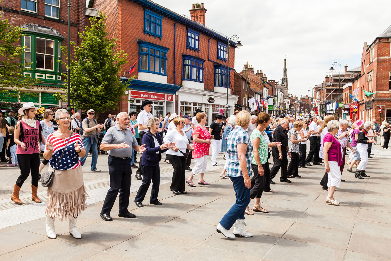 Dažādu vecumu cilvēki dejo līnijdeju. Līka, Stafordšīras grāfiste, Anglija, 21.06.2014.