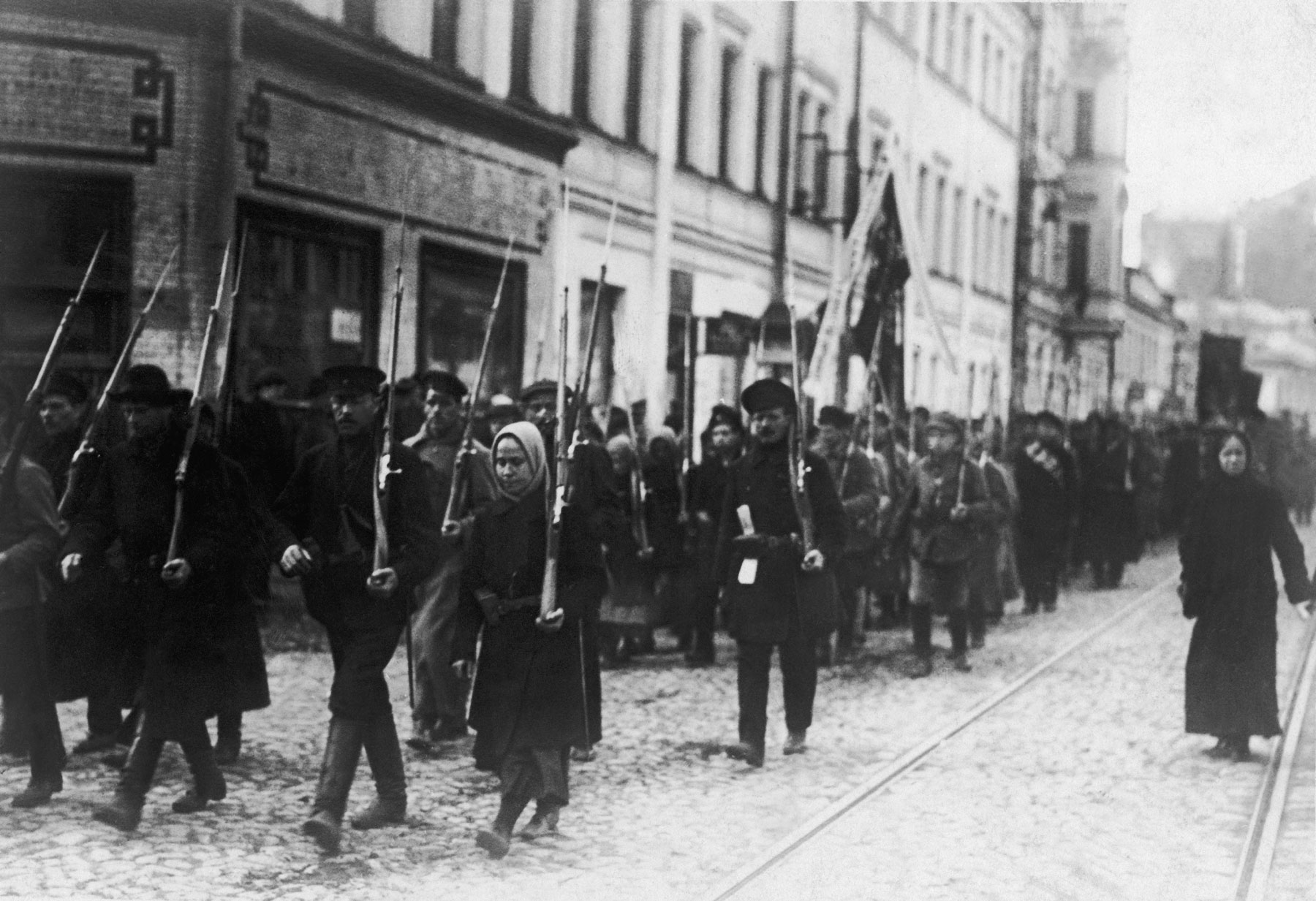 Bruņoti strādnieki kopā ar karavīriem Petrogradas ielās pēc Februāra revolūcijas. Krievija, 1917. gads.