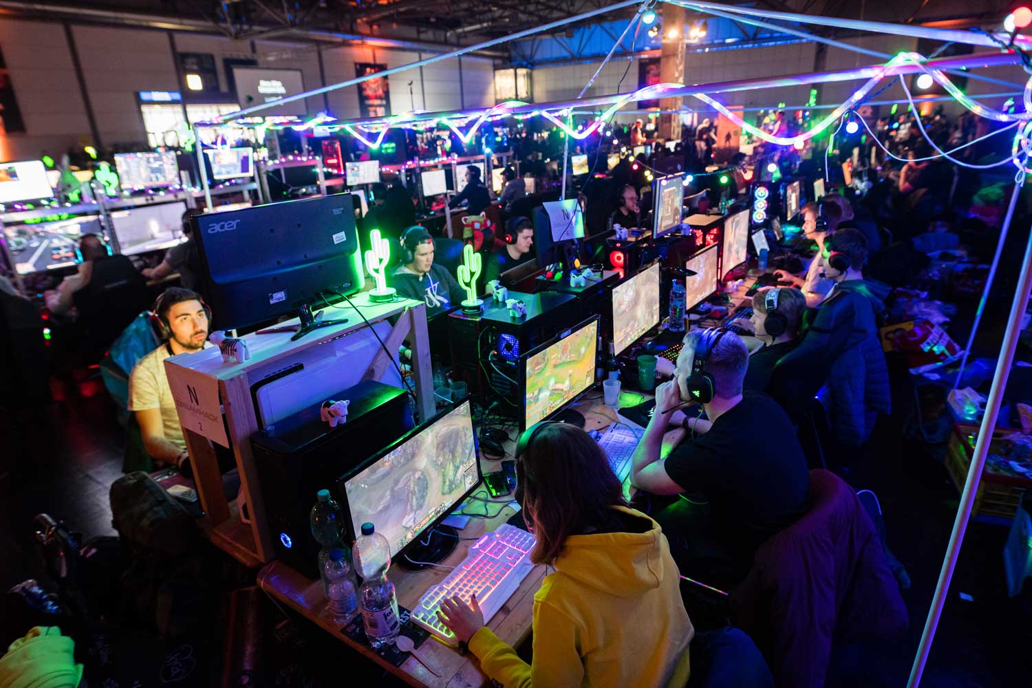 DreamHack Leipzig digitālā festivāla dalībnieki spēlē tīklā savienotas datorspēles lokālā datortīkla jeb LAN ballītes laikā. Leipciga, Vācija, 25.01.2020.