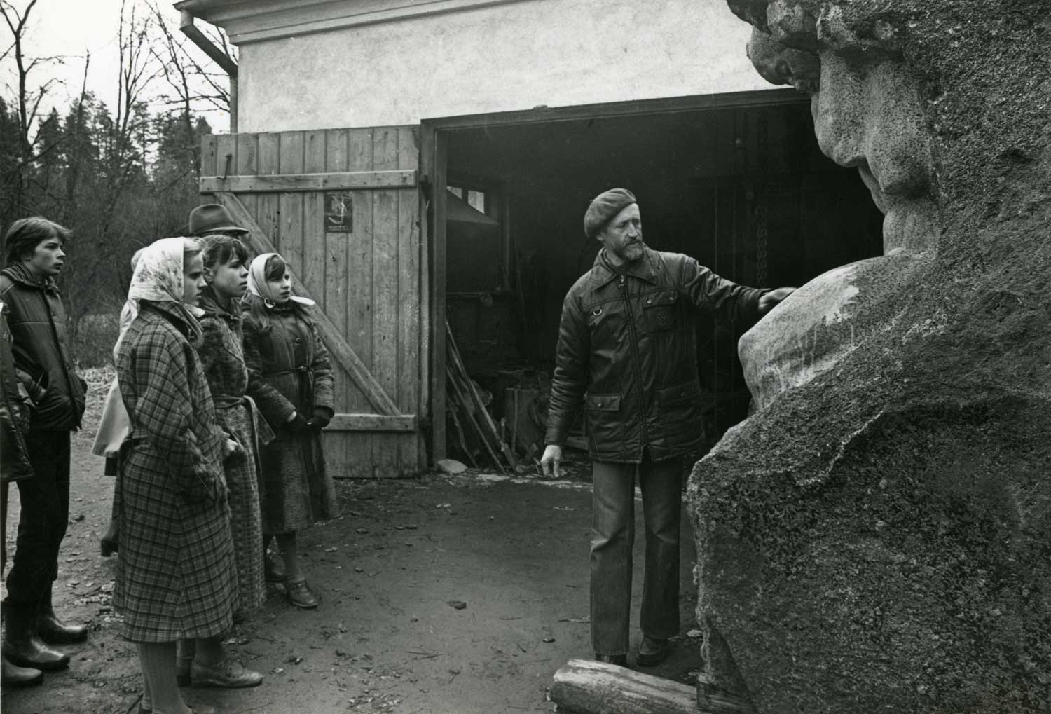 Tēlnieks Andrejs Jansons ar skolēnu grupu savā darbnīcā “Siļķēs”. 20. gs. 80. gadi.