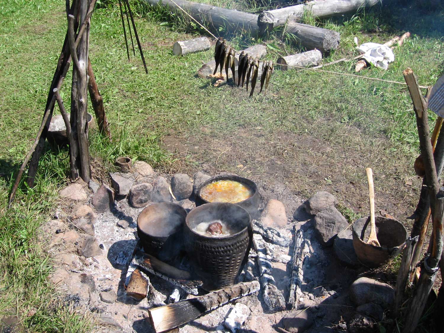 Pārtikas gatavošana dzelzs laikmeta trauku atdarinājumos Senās vides darbnīcas nometnē, 2008. gads.