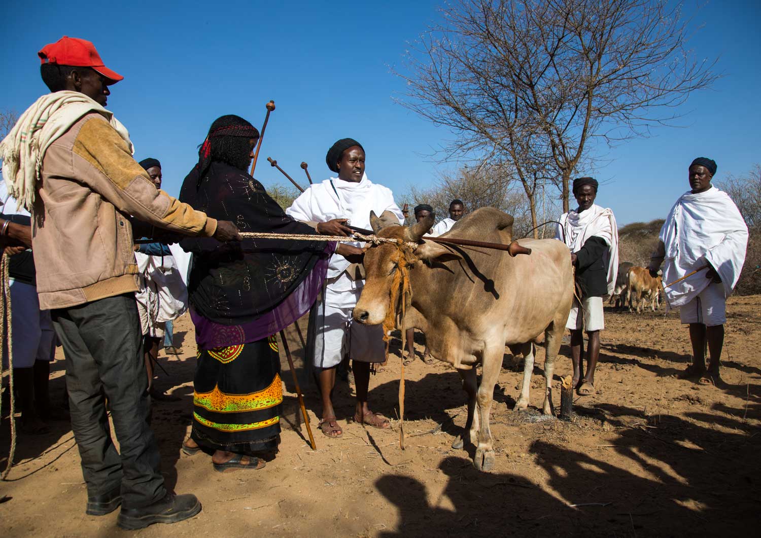 Oromo etniskās grupas Boranas cilts tradicionālā Gadā sistēmas ceremonija pirms rituālās vērša nokaušanas. Jabelo, Etiopija, 07.03.2017.