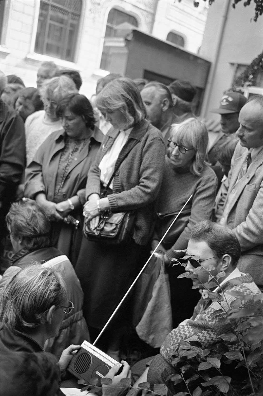Cilvēki Rīgā pie Augstākās Padomes ēkas klausās radio 1991. gada augusta puča laikā.