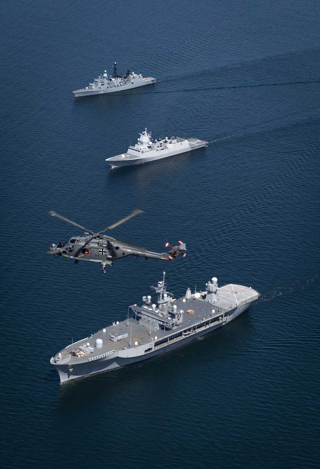 Ziemeļatlantijas līguma organizācijas (NATO) jūras spēki BALTOPS ikgadējo mācību laikā Baltijas jūrā. 08.06.2020. No apakšas uz augšu: amerikāņu Blue Ridge klases karakuģis “Mount Whitney”, vācu Mk88A Super Lynx helikopters, norvēģu Fritjofa Nansena klases fregate “Otto Suerdrup” un vācu Brēmenes klases fregate “Luebeck”.