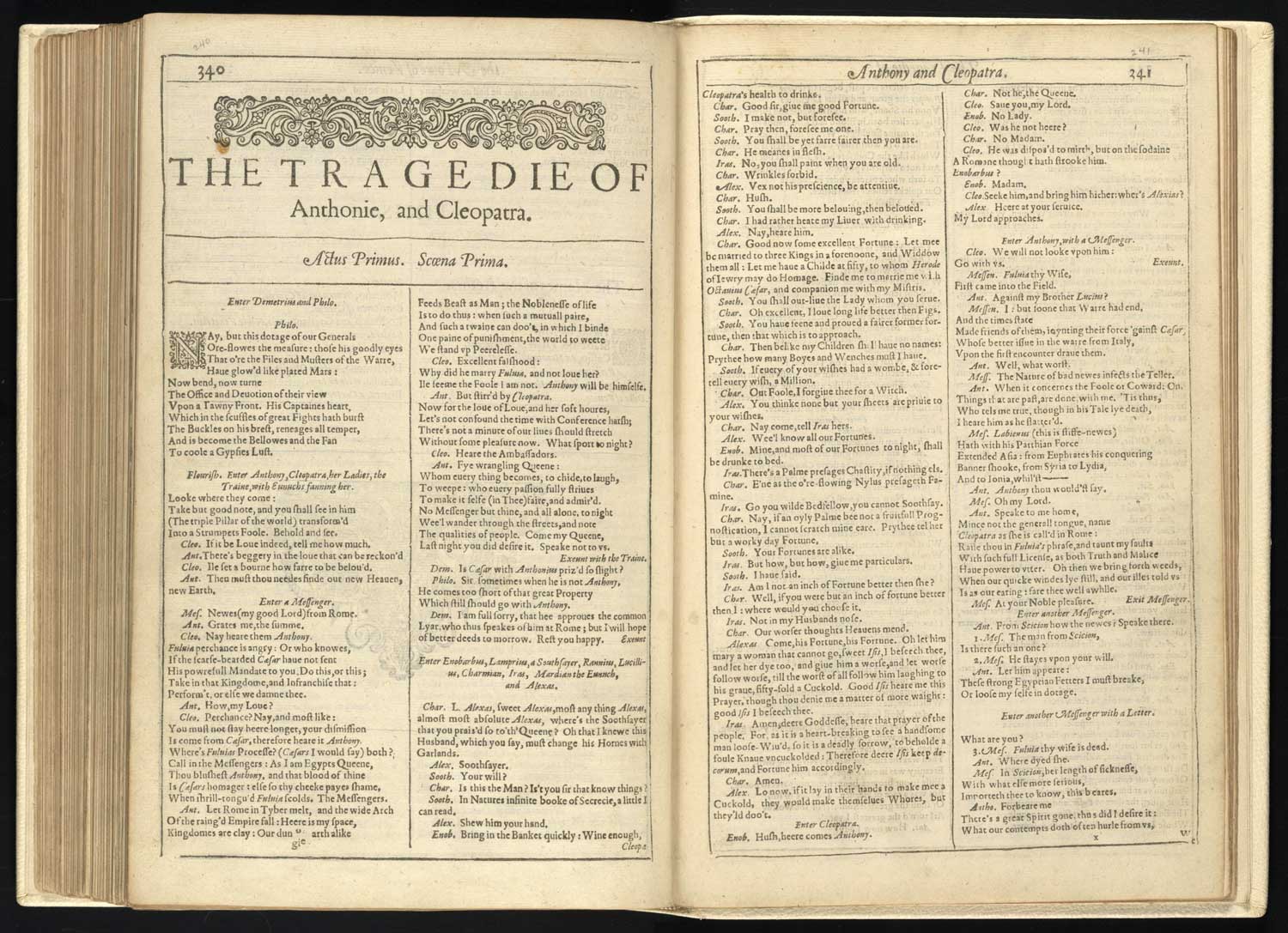Viljama Šekspīra traģēdijas “Antonijs un Kleopatra” atvērums izdevumā “First Folio“ jeb “Viljama Šekspīra kunga komēdijas, vēsturiskās hronikas un traģēdijas” (Mr. William Shakespeare’s Comedies, Histories & Tragedies). 1623. gads.
