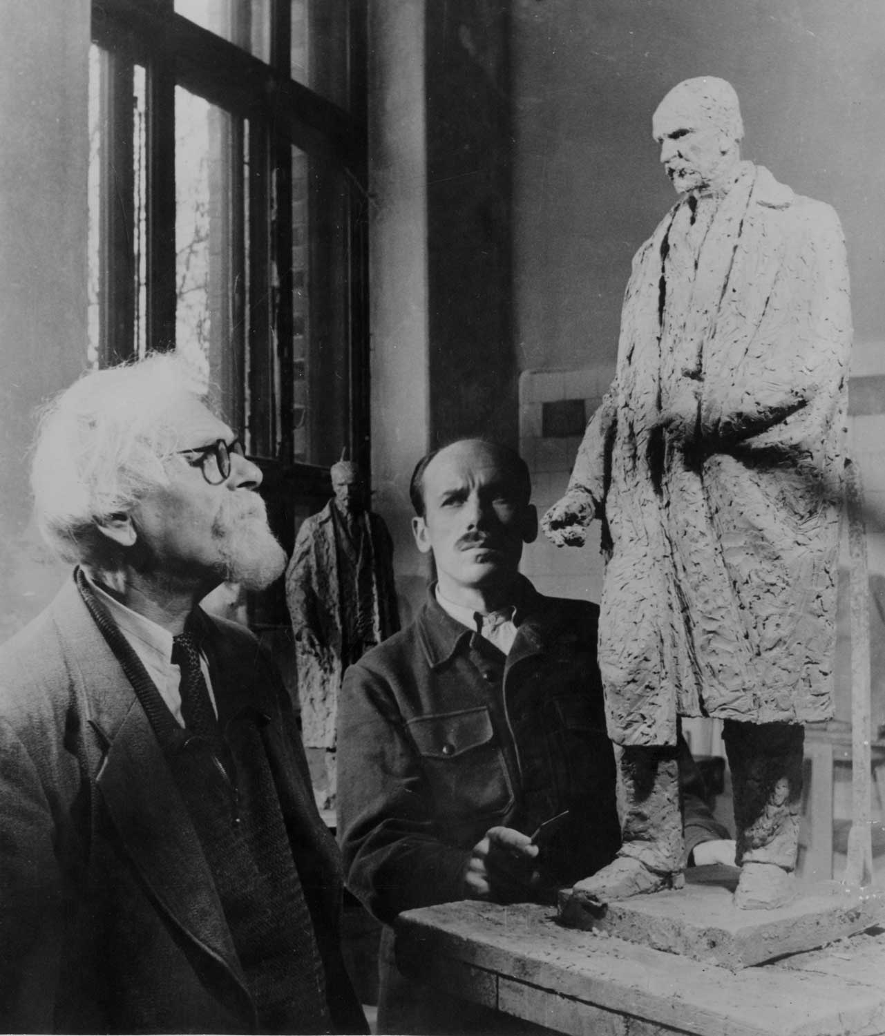 Profesors Teodors Zaļkalns (no kreisās) pie diplomanda Valda Alberga darba – Raiņa skulptūras. Latvijas PSR Valsts Mākslas akadēmija, Rīga, 12.1949.