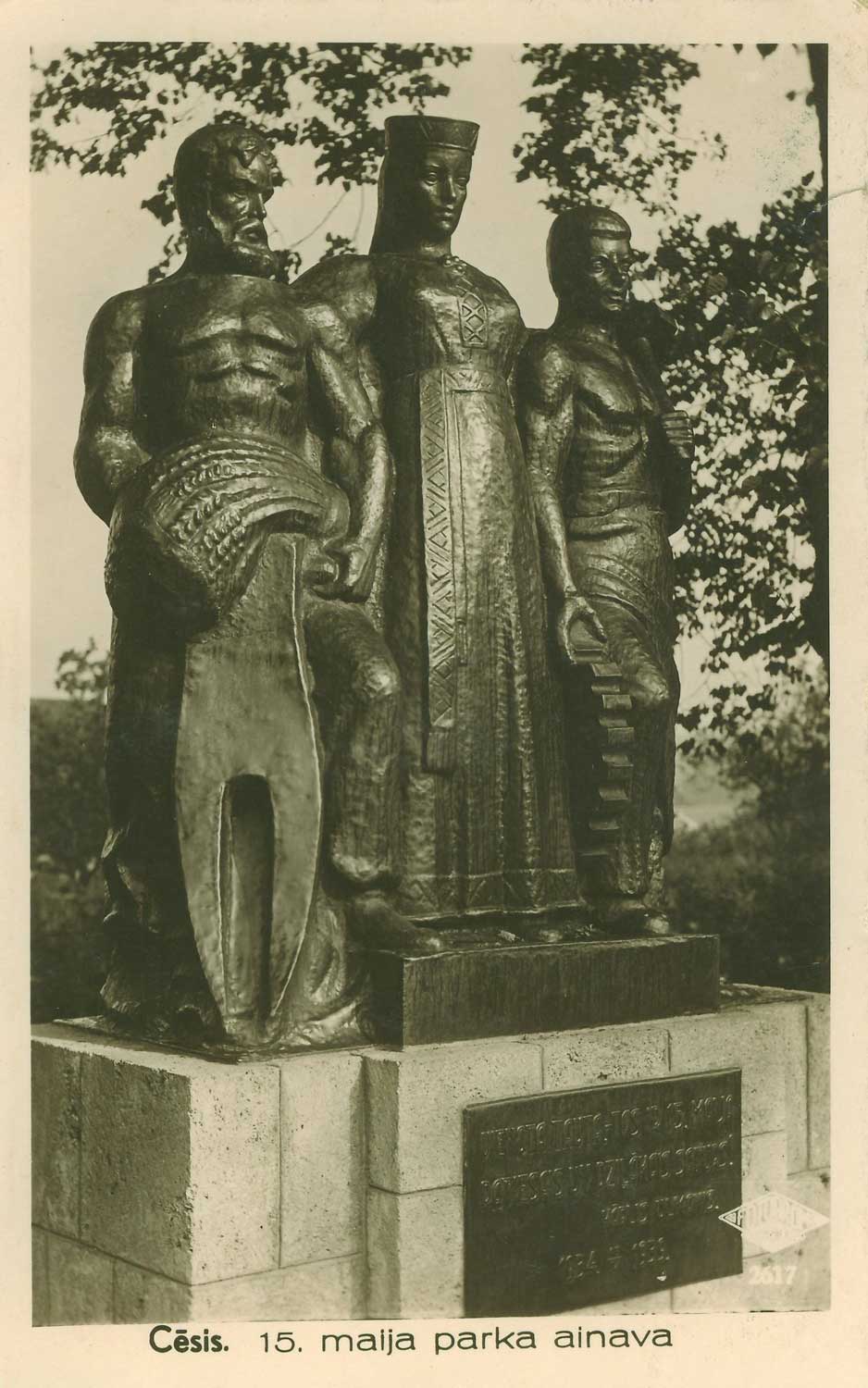 Piemineklis “Vienība” Maija parkā, Cēsīs. Izdevējs “Fotobroms”, Rīgā, ap 1939. gadu.