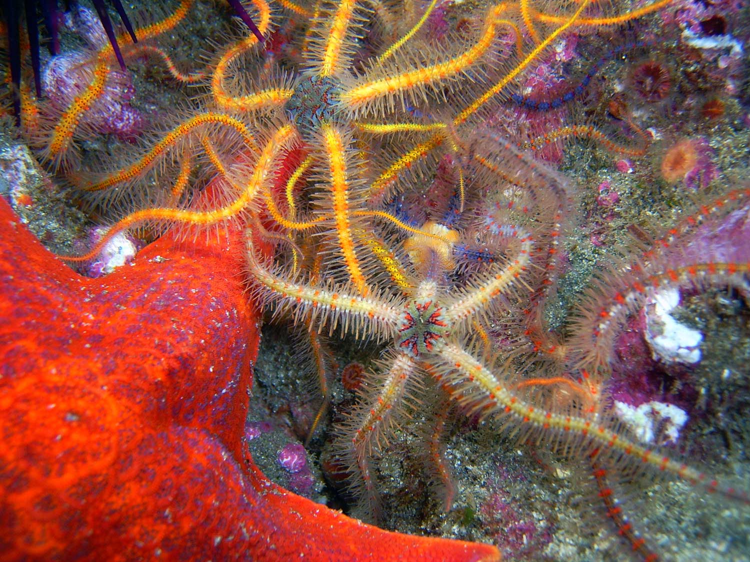 Oranžā sikspārņjūraszvaigzne un dzeloņainās čūskastes Kalifornijas piekrastes salu arhipelāgā Klusajā okeānā. 2016. gads.