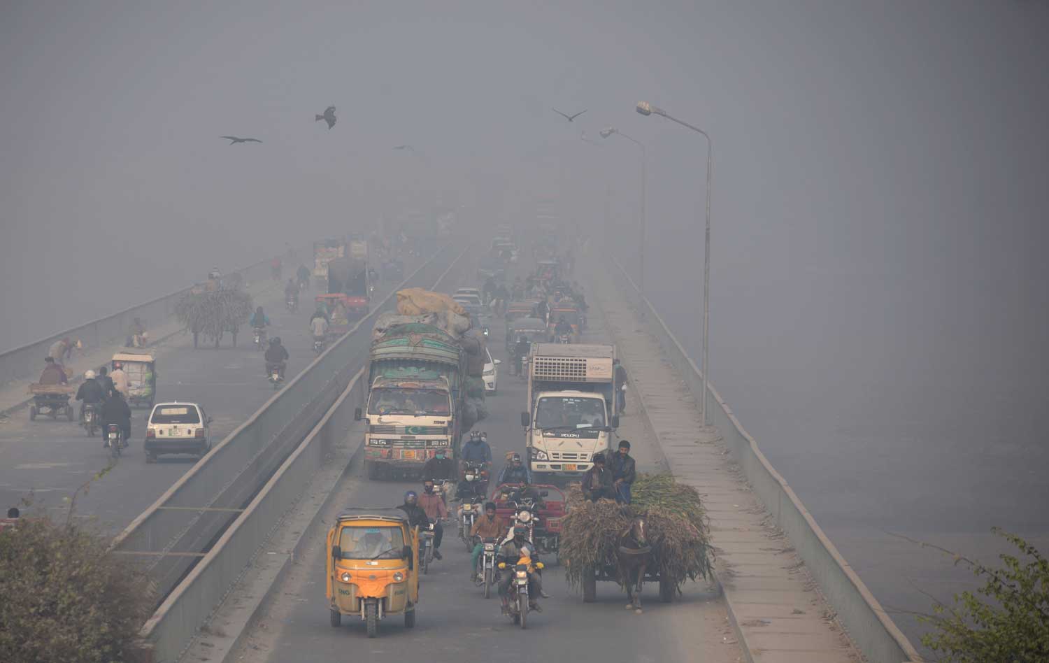 Cilvēki brauc pa ielu smoga apstākļos Lahorā, Pakistānā, 02.12.2021.