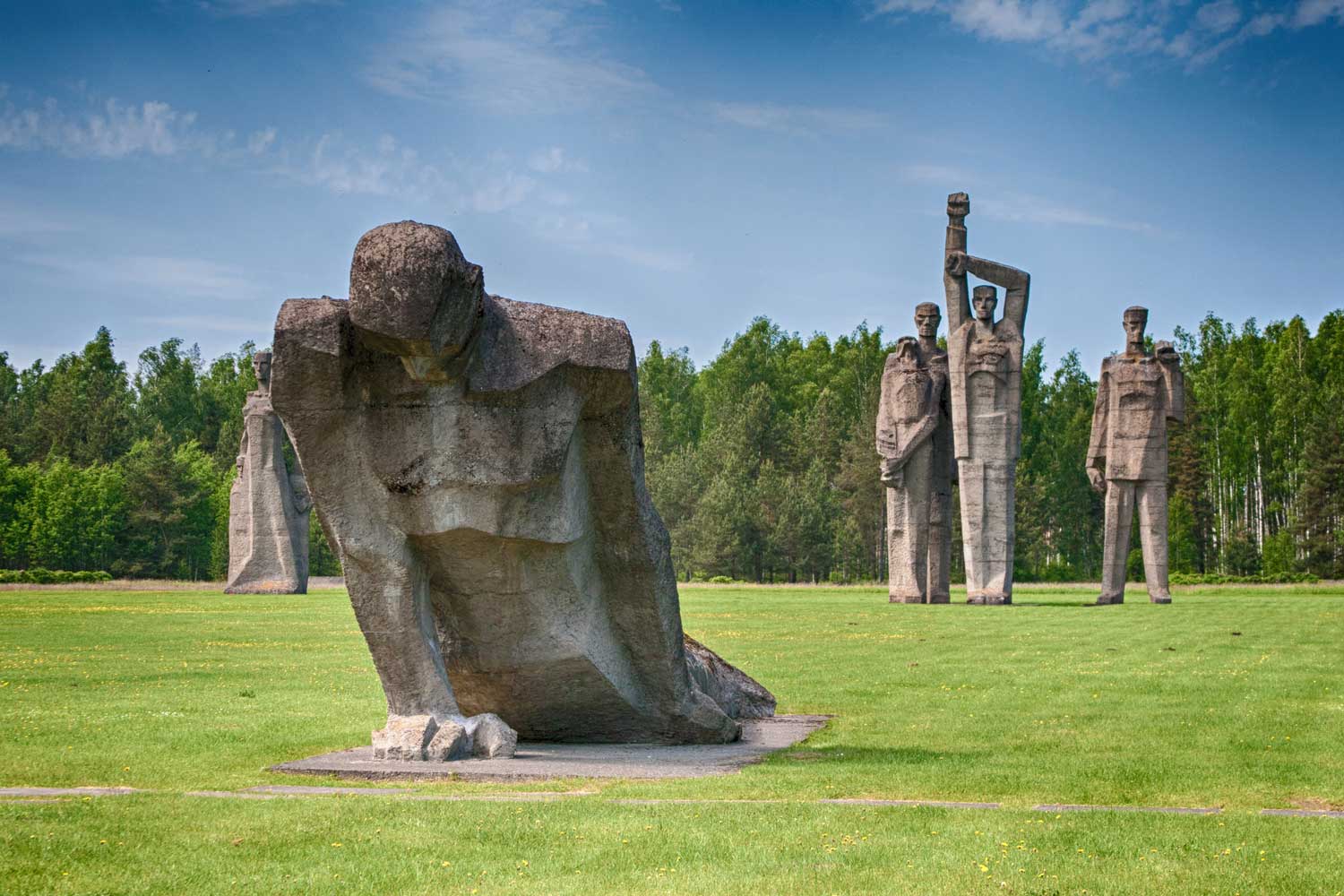 Ansambļa centrā, apejas ceļa ietverta, atrodas telpiski labi sabalansēta skulptūru grupa: “Nesalauztais”, “Pazemotā”, “Māte” un tematiski vienota četrfigūru grupa “Protests”, ko veido skulptūras “Solidaritāte”, “Rot front” un “Zvērests”. Skulptūru tematika atbilst oficiālajam padomju ideoloģijas naratīvam par ciešanām, solidaritāti un pretošanos nacistu okupācijai, kaut gan bija zināms, ka organizēta sacelšanās un pretošanās Salaspilī nenotika. Figūras ir vispārinātas, risinātas šķautņainās oļbetona formās un atbilst tolaik tā dēvētajai “skarbā stila” ievirzei.