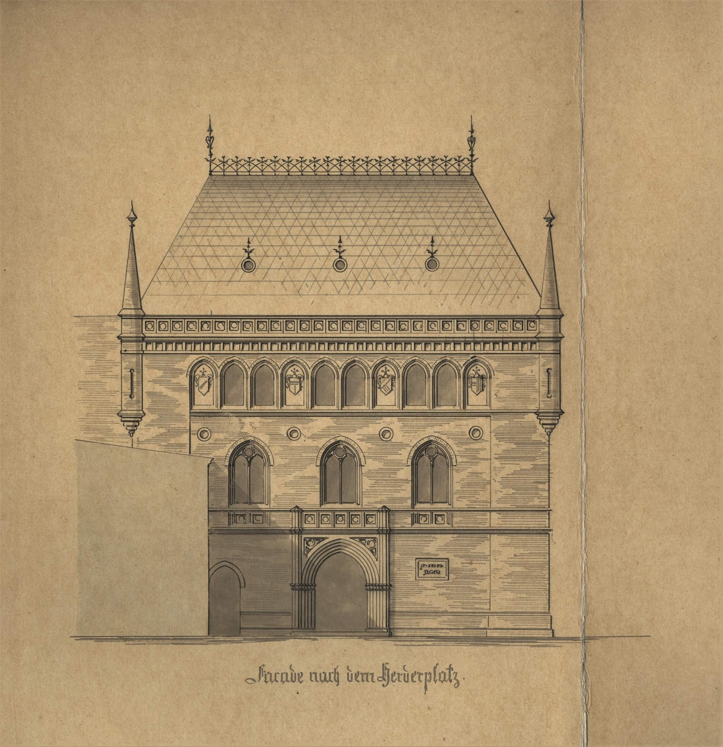 Rīgas Doma muzeja (mūsdienās – Rīgas vēstures un kuģniecības muzejs) galvenās fasādes projekta zīmējums. 1888. gads. Arhitekts Karls Neiburgers.