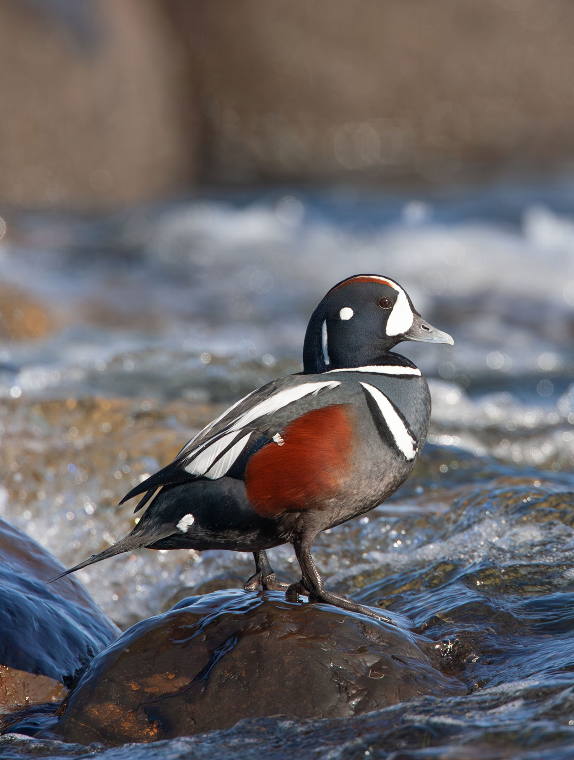 Arlekīnpīle (Histrionicus histrionicus) – jaunais putns. Rīga, 29.10.2016.