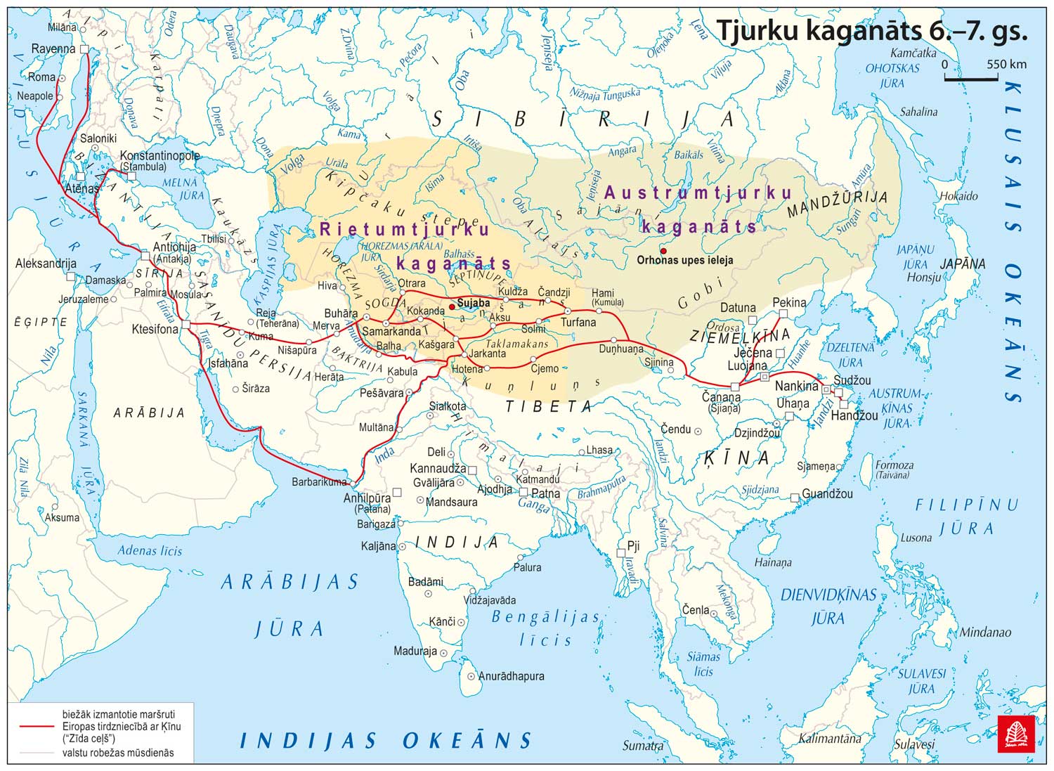 Valsts bija izteikti orientēta uz ekspansiju, kas pamatā ritēja rietumu virzienā, cenšoties sagrābt Zīda ceļa centrālo daļu. Jau 555. gadā tjurki bija iekarojuši Septiņupi un visu mūsdienu Kazahstānas stepju zonu līdz pat Arāla jūrai. Šo iekarojumu rezultātā Tjurku kaganāts pārņēma savā kontrolē Zīda ceļu un visu reģiona tranzīta tirdzniecību, taču nonāca saskarē ar reģiona lielvalstīm: heftalītu jeb t. s. balto huņņu valsti, Persijas Sasanīdu Impēriju un Bizantijas Impēriju. Tjurku kaganāts visai labi iekļāvās tā laika starptautiskajā politikā, veidojot attiecības ar Bizantiju un noslēdzot savienību ar persiešiem, kopā vēršoties pret heftalītiem. 565. gadā heftalītu valsts tika sagrauta, tās zemes sadalot uzvarētāju starpā. Taču jau 569. gadā, aizstāvot zīda tirgotāju intereses (Ziemeļķīnas valstis – Ziemeļu Ci un Ziemeļu Džou – maksāja kaganātam meslus zīda baķos, savukārt persieši slēdza savas robežas zīda importam, jo paši eksportēja to un vēlējās saglabāt augstas cenas), tika noslēgta savienība ar Bizantiju pret Sasanīdu Persiju un īstenots veiksmīgs karagājiens, kas piespieda Persiju atvērt savas robežas tirgotājiem no kaganāta pilsētām un maksāt ikgadējus meslus. Lai nodrošinātu pastāvīgu tirdzniecību ar Bizantiju, 571. gadā kaganāts iekaroja stepi ziemeļos no Kaspijas jūras uz Ziemeļkaukāza priekškalnes līdz Krimai, kas ļāva izveidot jaunu ziemeļu tirdzniecības ceļu trasi no Arāla jūras uz Melno jūru.