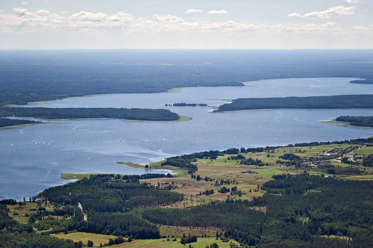 Ezera krasta līnija ir izrobota līčiem un pussalām. Ezerdobe ir ļoti nelīdzena ar daudz dziļumiem un sēkļiem. Ezerā ir četras salas – Viskūžu sala, Moricsala, Lielalksnīte un Mazalksnīte. Viskūžu sala ir lielākā ezera sala (3,1 km2) Latvijā. Starp salu un ezera rietumu krastu ir 160–200 m plats, 1,3 km garš, līkumots šaurums, kuram piešķirts nosaukums Amjūdzupe (morfoloģiskās līdzības dēļ ar upi).