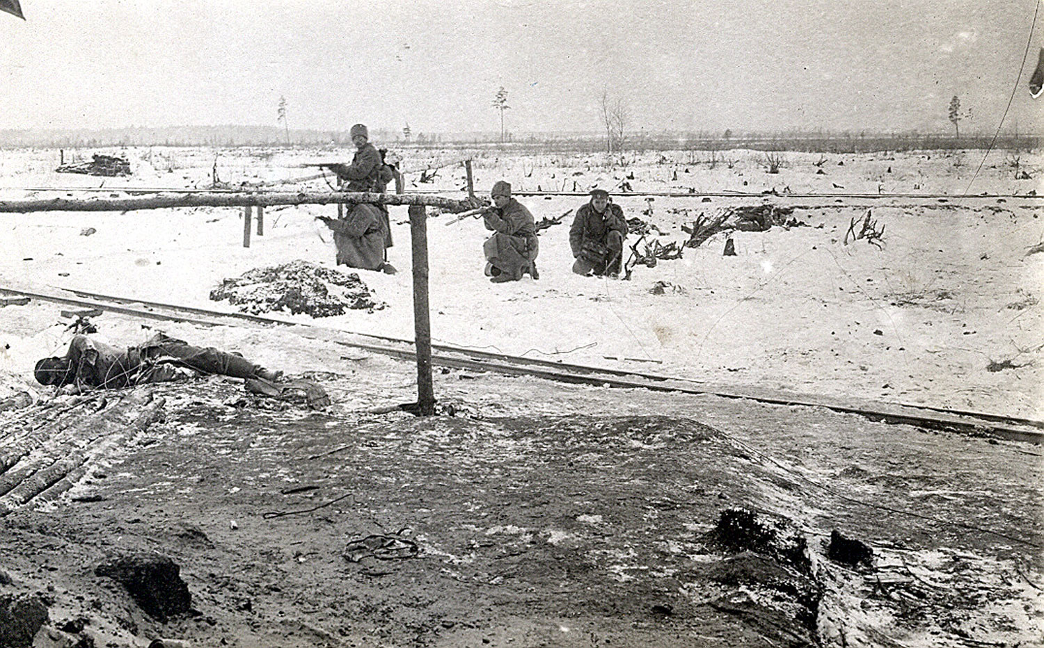 3. Kurzemes latviešu strēlnieku pulka karavīri pie vācu nocietinājumu pirmās līnijas Tīreļpurvā. 01.1917.