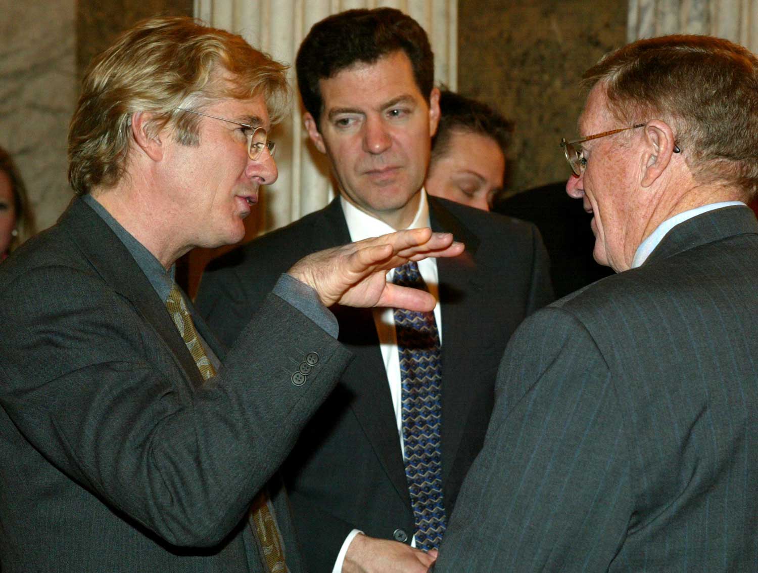 No kreisās: aktieris Ričards Gīrs (Richard Gere) lobē tibetiešu intereses sarunā ar senatoru Petu Robertsu (Pat Roberts) un Konredu Bērnsu (Conrad Ray Burns). Vašingtona, ASV. 12.11.2003.