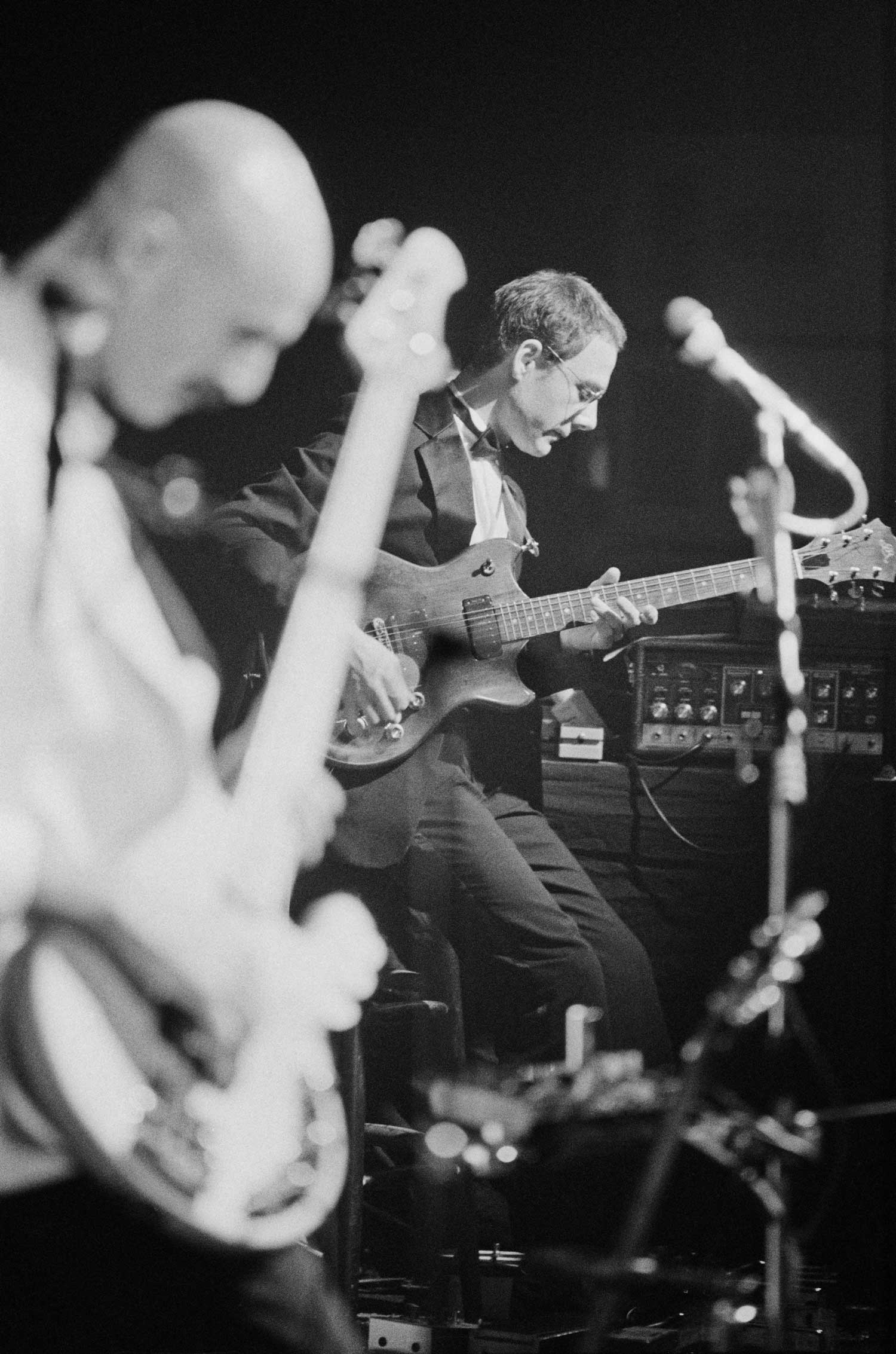 King Crimson. Londona, 1982. gads. No kreisās Tonijs Levins un Roberts Frips.