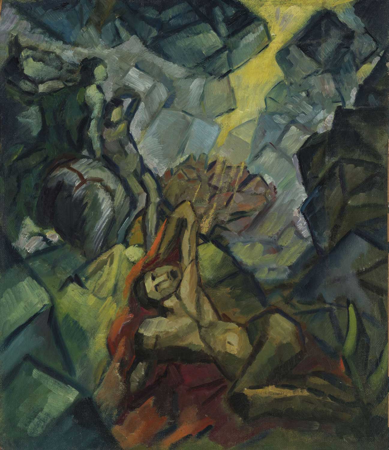 Postimsimbolisma destruktīvajās kompozīcijās “Zemestrīce”, “Lāokoonta motīvs” un “Golgāta” paustas dziļa pārdzīvojuma piesātinātās idejas. Ekspresīvie gleznojumi, kas stāsta par cilvēka ciešanām un iekšējo cīņu, nenoliedzami ir kā pēckara sindroms pēc trim Vācijas gūstekņu nometnēs pavadītajiem gadiem. Pēc šiem kaleidoskopiskajiem notikumiem smagi iedragātā veselība un morālie pārdzīvojumi izraisīja māksliniekā vēlmi atklāt uz audekla savas dvēseles mokas. Tikai no reprodukcijām zināmās E. Lindberga gleznas “Apraudāšana” un “Kompozīcijas skice” datētas ar 1919. gadu, un šajā laikā varētu būt tapušas arī trīs analoģiskā sezaniskā rokrakstā gleznotās simboliskās kompozīcijas no Latvijas Nacionālā mākslas muzeja kolekcijas. “Zemestrīcē” atainoti šausmās sastinguši cilvēku stāvi, uz kuriem no klintīm gāžas milzīgi akmens kluči, radot pasaules bojāejas situācijas izmisuma pilno bezizejas sajūtu. Klasiskajā “Golgātas” kompozīcijā krustā sistā Jēzus nedzīvi pelēkais augums un izmisušais mocekļa skatiens izraisa depresīvu noskaņu, un atdzīvināšanas nolūkā E. Lindbergs vismaz krāsaināk iegleznojis Dievmātes Marijas un Jāņa Kristītāja eksaltētās figūras. Savukārt “Lāokoonta motīva” izstieptie, ar lauzītām, ekspresīvām šķautnēm veidotie cilvēku stāvi à la El Greko (El Greco) raisa nepārprotamas asociācijas ar spāņu klasiķa gleznu “Lāokoonts” (1604/1608–1614; Nacionālā mākslas galerija, National Gallery of Art, Vašingtona). Ir zināmi vairāki atšķirīgi mīti par sengrieķu priestera Lāokoonta (Λαοκόοντος) nedienām, taču slavenākā aina, kurā viņš ar abiem dēliem cīnās ar čūskām, ir Rodas meistaru Agesandra (Αθηνόδωρος), Polidora (Πολύδωρος) un Atanadora (Αγήσανδρος) marmorā kaltā “Lāokoonta grupa” (Σύμπλεγμα του Λαοκόοντος, 1. gs. p. m. ē., Vatikāna muzejā, Musei Vaticani). E. Lindberga glezna pauž emocionāli trauslas personības plosošās šaubas un grūtsirdību; būdams neapmierināts ar sasniegto, mākslinieks daudzus darbus pats iznīcinājis.