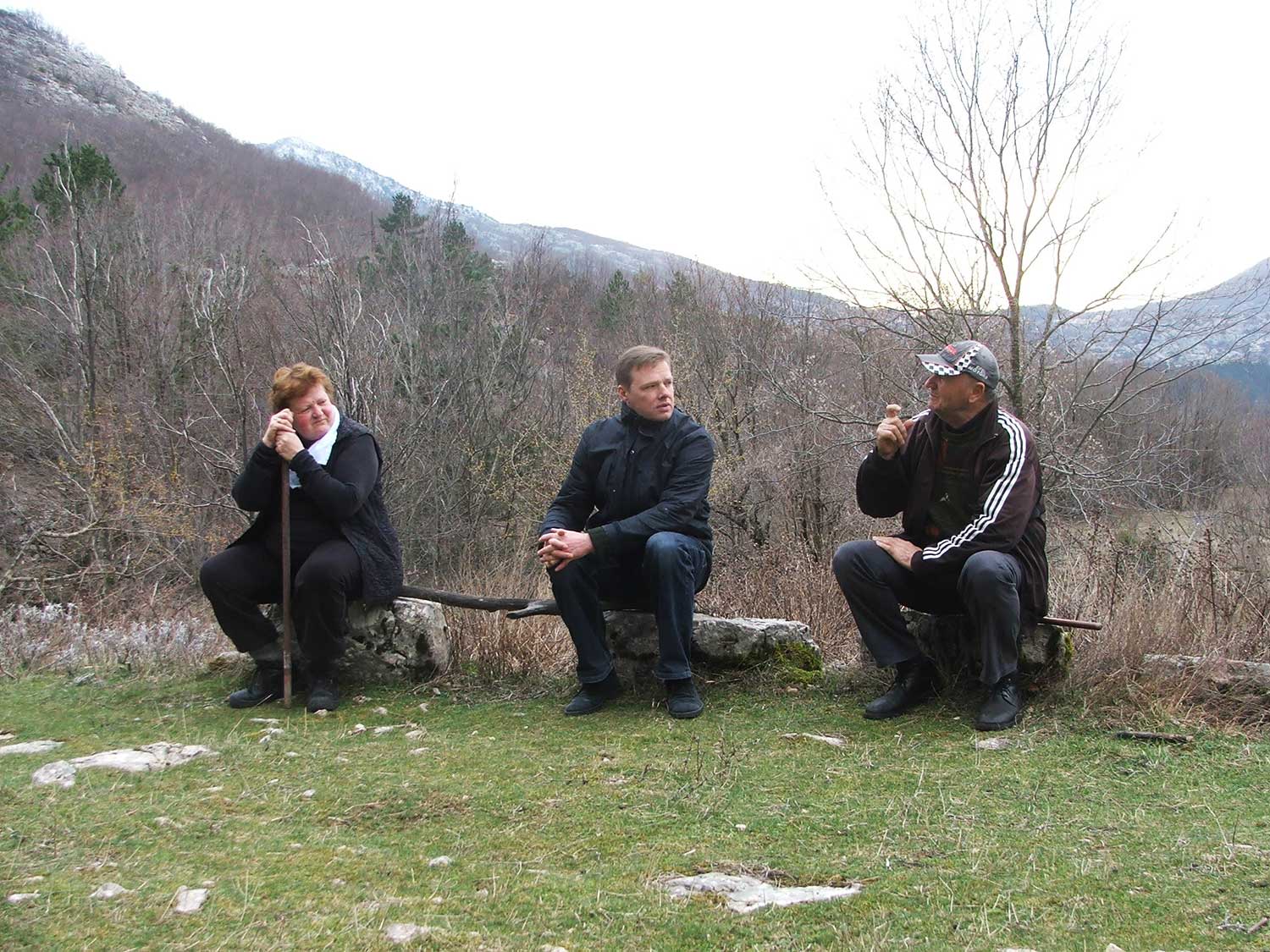 Klāvs Sedlenieks (vidū) sarunājas ar pētījuma dalībniekiem Ņegušos, Melnkalnē. 2017. gads.