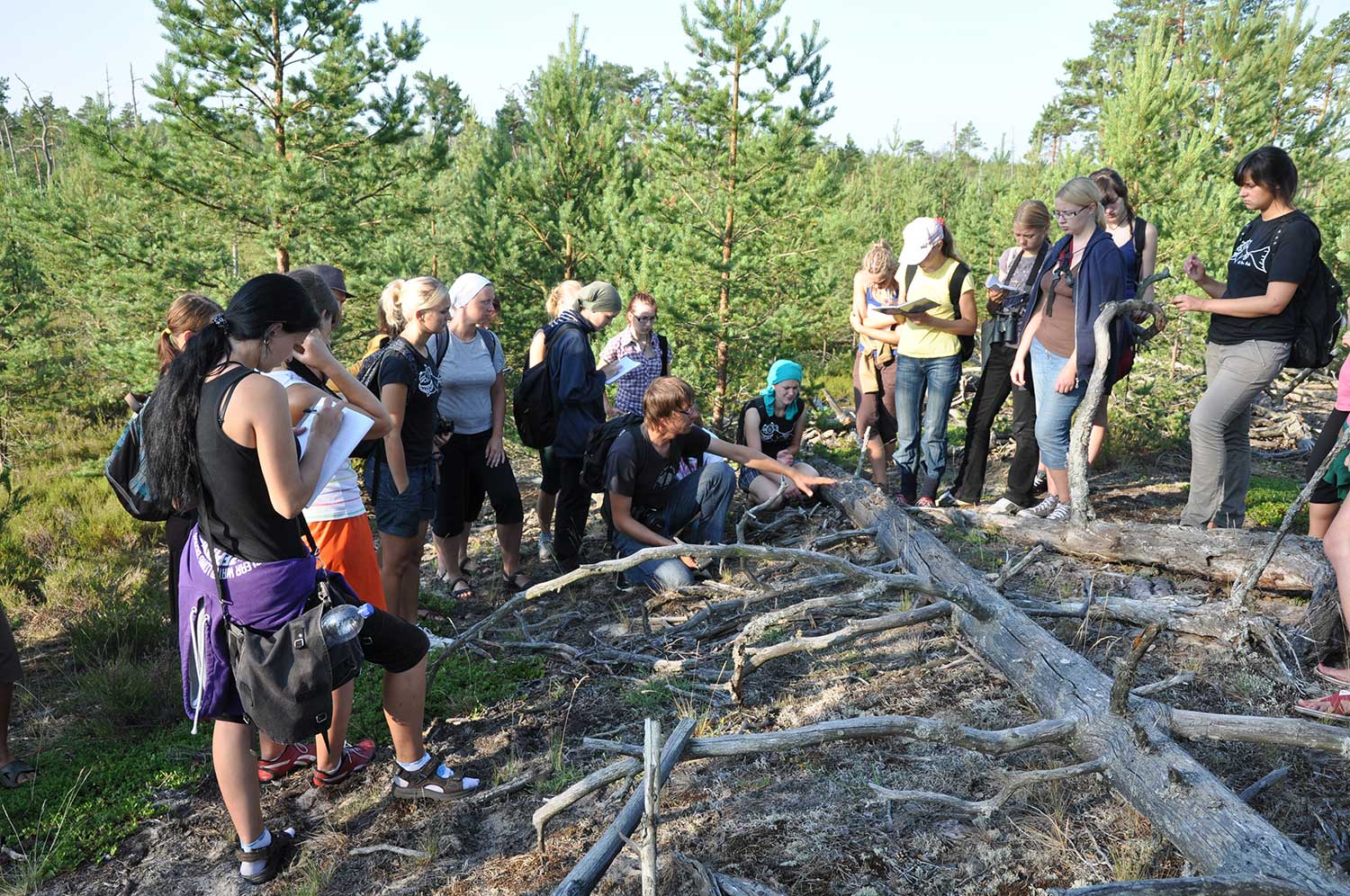 Saproksilo sugu ekoloģiskās izpētes demonstrējums LU Bioloģijas fakultātes studentu prakses laikā. Slīteres Nacionālais parks, 2010. gads.