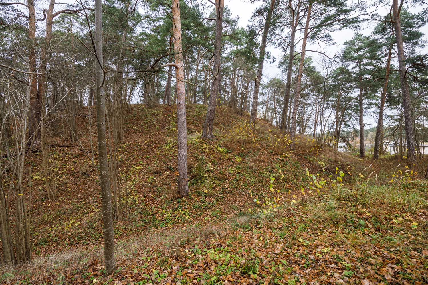 Par Tukuma pilskalnu pierakstīts salīdzinoši daudz teiku. Ap 1890. gadu Ansis Lerhis-Puškaitis pierakstījis vismaz trīs saturiski atšķirīgas teikas. Viena vēstī par to, ka kalnā nogrimušajā pilī pa palikušo caurumu nolaidies kāds drošs vīrs, kurš aiz diviem vārtiem nokļuvis tādā pat pasaulē kā virszemē. Tur bijuši daudz ļaužu, kuri tur strādājuši, un apkārt viss mirdzējis zeltā, sudrabā, dimantā. Kad pamanījuši svešinieku, pavēlējuši tam iet prom. Viņš negribīgi paklausījis, bet, ticis virszemē, centies dārgumus atrakt, bet, ko pa dienu izracis, tas pa nakti aizgruvis. Otra stāsta par kādu cilvēku, kurš pusnaktī no Tukuma devies mājās pāri pilskalnam, kur pie ugunskura sastapis kādu nerunīgu vecīti. Cilvēks apsēdies, uzpīpējis savu pīpīti, bet uzsākt sarunas ar vecīti tā arī nav izdevies. Vīrs sapīcis devies projām, bet no rīta pīpē atrod nevis pelnus, bet dukātus. Trešā teika vēsta par kādu saimnieku, kurš kopā ar brāli pēc nosapņota sapņa pie netālu no pilskalna esoša akmens izrakuši lielu naudas katlu, bet izbijušies no melnā lāča, un atraktais naudas katls skanēdams nogrimis. 1930. gadā pierakstīta teika par sieviņu, kura pilskalnā iemigusi un pamodusies pazemē kādā greznā dzīvoklī, kur tai likts auklēt šūpulī esošu bērnu, par ko, pie nosacījuma, ka par to nevienam nestāstīs, saņēmusi kurvi ar naudu. Šo iespēju sieviņa vēl vairākas reizes izmantojusi. Vēl ap to pašu laiku pierakstīta teika par to, kā kāda sieviete aicināta uz pili visādus darbus darīt, bet arī par to nevienam nedrīkstēja stāstīt. Kad viņa par notikušo pastāstījusi vīram, abi pārvērtušies par akmeņiem, bet staltā pils nogrimusi. Esot arī teika par romantisku mīlestību starp latviešu (vai lībiešu) virsaiša meitu un vācu ordeņmestra dēlu, kuri mīlas dēļ gāja bojā. Pierakstīta arī par daudziem Latvijas pilskalniem bieži izplatītā teika par pīli, kas ielaista kalnā nogrimušās pils skursteņa caurumā, izpeld kādā tuvumā esošā ūdenstilpnē – konkrētā gadījumā Tukuma ezerā.