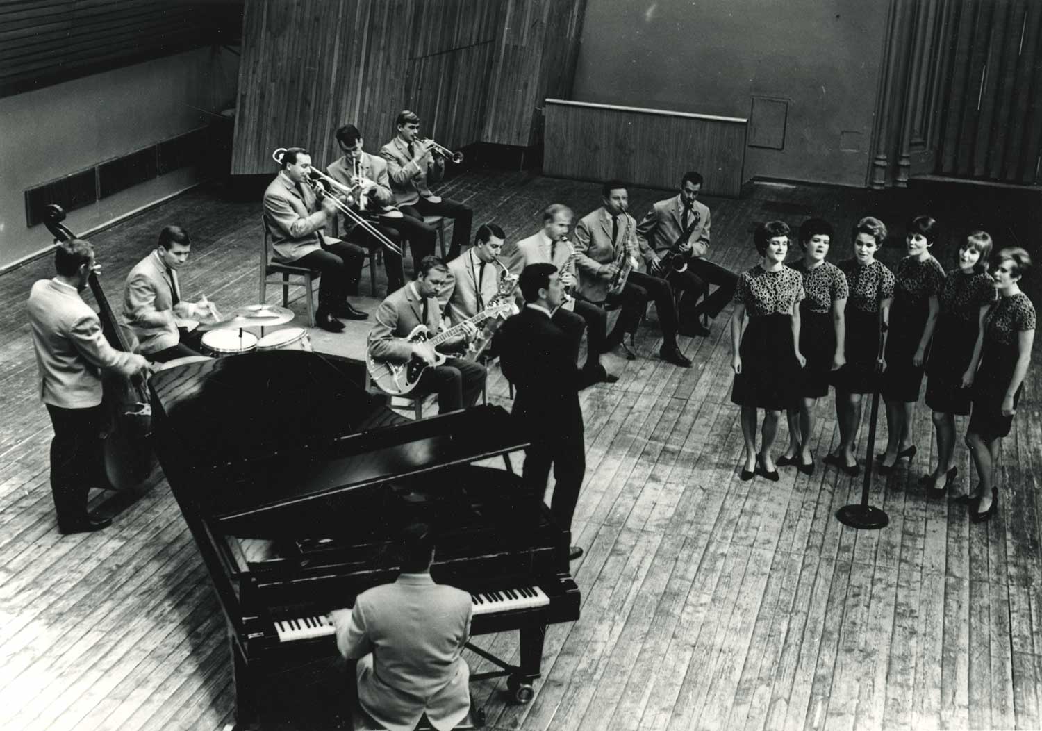 Rīgas estrādes ansamblis Latvijas TV studijā, diriģents Ringolds Ore, pie klavierēm Raimonds Pauls. Rīga, 1958. gads.