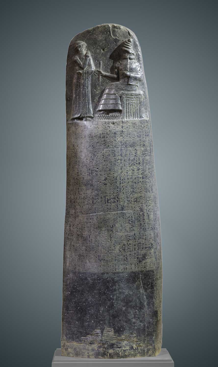 Hammurapi likumu krājums iekalts akmens stēlā. Babilonijas civilizācija, 18. gs. p. m. ē.