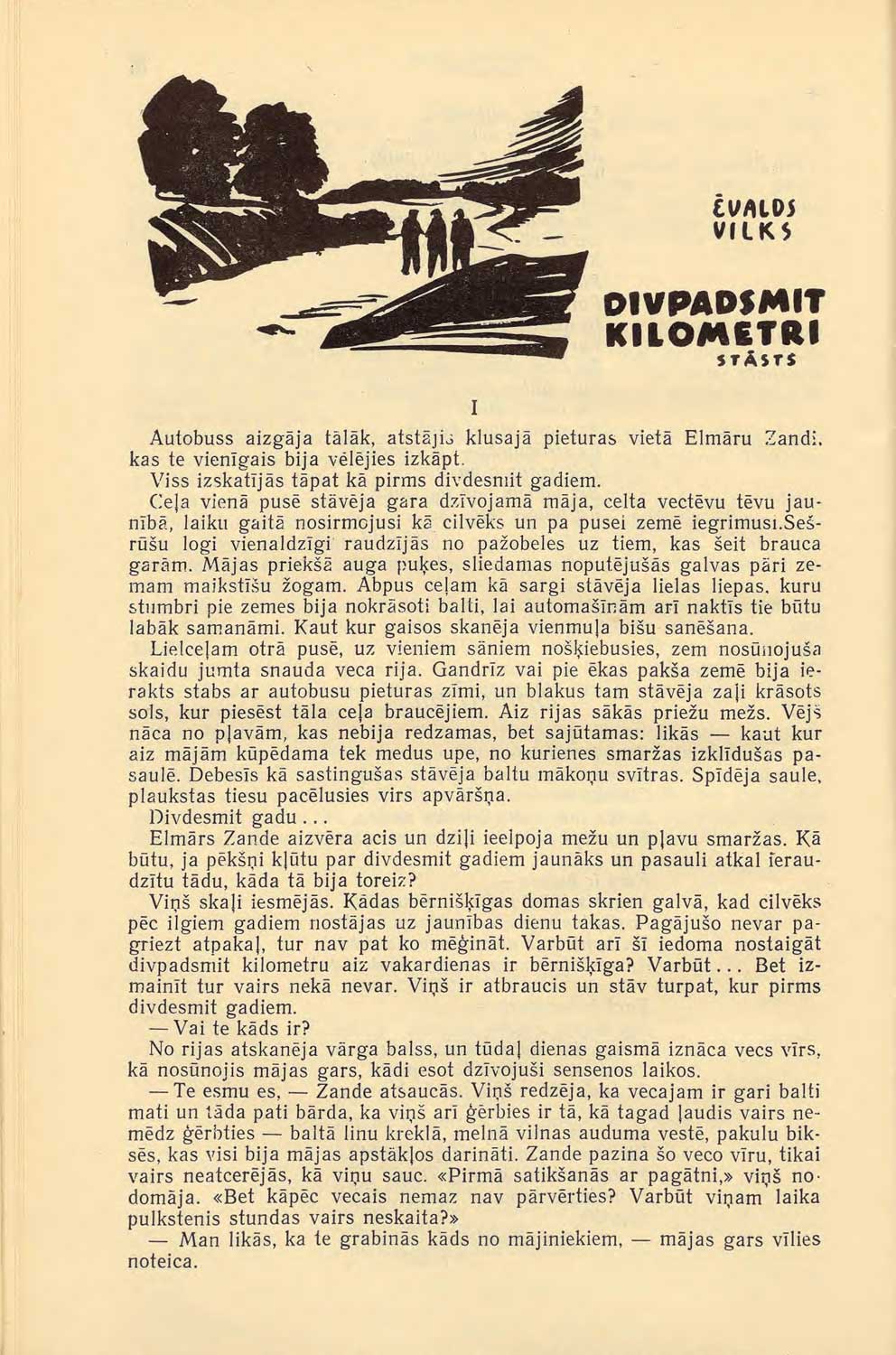 Ēvalda Vilka stāsta “Divpadsmit kilometri” pirmpublicējums žurnālā “Karogs”. Karogs, Nr. 3 (01.03.1963.), 76. lpp.