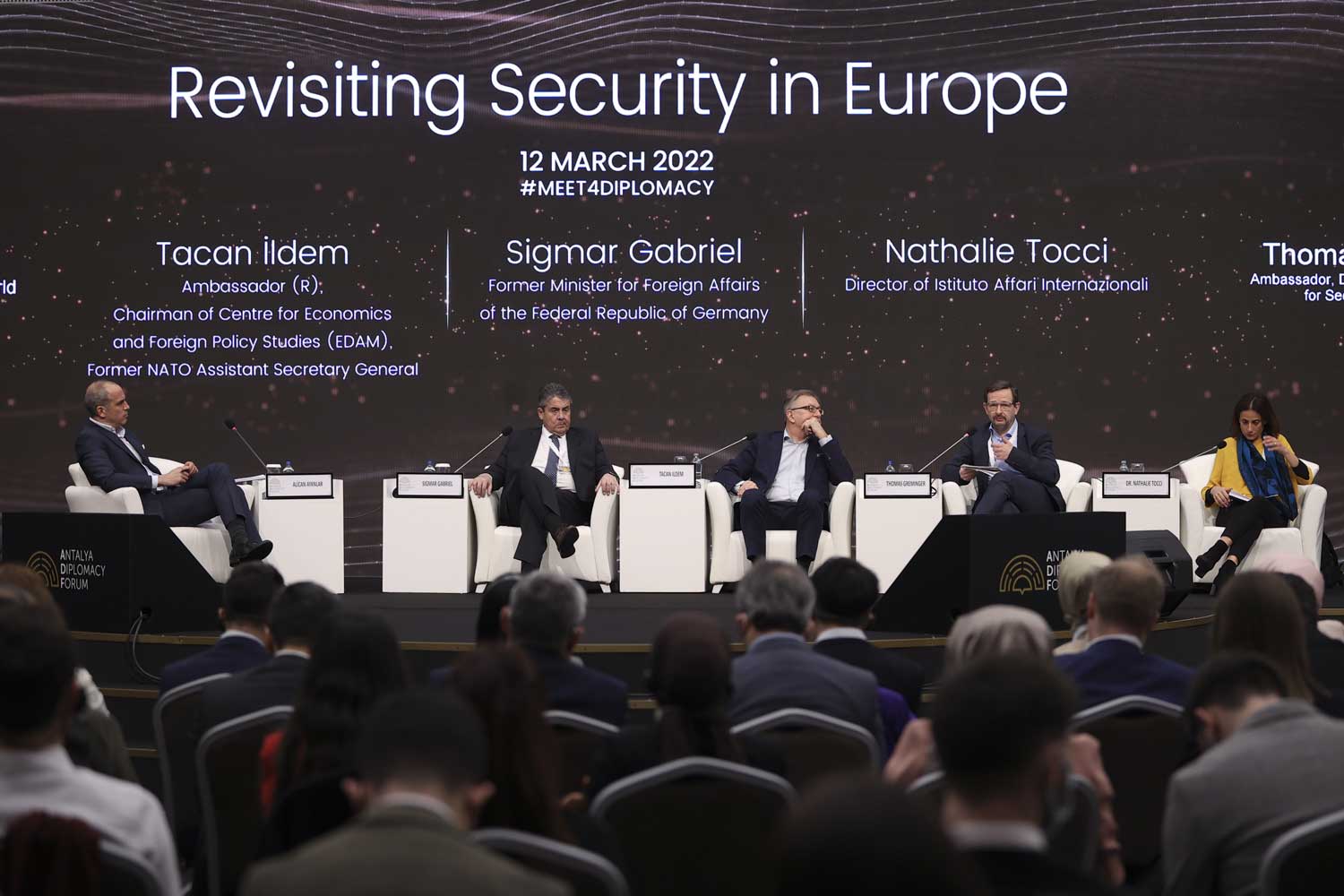 Bijušais Vācijas ārlietu ministrs Zigmārs Gabriels (Sigmar Gabriel), Ekonomikas un ārpolitikas pētījumu centra vadītājs Takans Ildems (Tacan Ildem), Ženēvas drošības politikas centra vadītājs Tomass Gremingers (Thomas Greminger) un Starptautisko attiecību institūta direktore Natālija Toči (Nathalia Tocci) piedalās paneļdiskusijā "Pārskatot drošību Eiropā" (Revisiting security in Europe) Antaljas diplomātijas forumā. Turcija, 12.03.2022.