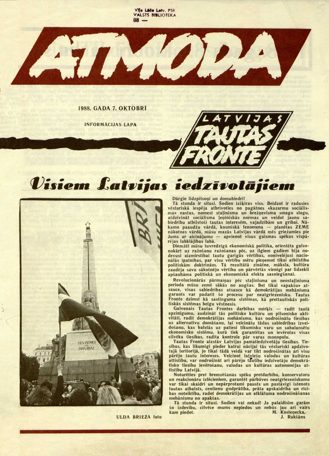 Avīze iznāca Rīgā no 16.12.1988. līdz 07.04.1992., no 06.01.1999. reizi nedēļā latviešu un krievu valodā. 07.10.1988., dienu pirms LTF dibināšanas kongresa, Latvijas Padomju Sociālistiskās Republikas (LPSR) Rakstnieku savienība un LTF koordinācijas centrs izdeva A4 formāta četru lappušu informācijas lapu ar nosaukumu “Atmoda”, tāpat LTF turpināja izdot informācijas biļetenu ar šādu nosaukumu (1992–1994). No 12.05.1989. krievu izdevumam bija atsevišķa redakcija, no 28.05.1990. līdz 11.1992. tas iznāca ar nosaukumu “Baltijskoe vremja”. Vienreiz mēnesī izdeva Awakening angļu valodā (1989–1992). Laikraksts nāca klajā A3 formātā, sākotnēji uz četrām, vēlāk uz astoņām lappusēm. No 1989. gada vasaras latviešu izdevums bija uz 16 lappusēm. Laikraksts “Atmoda” bija LTF kā masveidīgās organizācijas plašā politiskā spektra daudzveidīgo strāvojumu komunikācijas forums, neatkarības un demokrātijas atjaunošanas kustības intelektuālais virzītājs un izšķiroši nozīmīgs LTF propagandas un aģitācijas izdevums, sevišķi pirmsvēlēšanu laikā. Tā kā avīzes galveno redaktoru iecēla LTF kongress, tas nodrošināja lielāku gan tās ārējo (iepretī padomju iestādēm), gan iekšējo preses brīvību (redakcionālo autonomiju jeb neatkarību no LTF priekšsēdētāja un valdes kā izdevēja priekšstāvjiem un patstāvīgu redakcionālo politiku). Šā principa iedibināšana mūsdienu Latvijas presē lielā mērā bija galvenās redaktores Elitas Veidemanes nopelns, kuru pirmoreiz amatā apstiprināja LTF 2. kongress (1989), tāpat kā Alekseju Grigorjevu par “Baltijskoe vremja” galveno redaktoru. Angļu izdevuma redaktore – Sarma Dindzāne. Saturiski un vizuāli “Atmoda” tika veidots kā tipisks propagandas izdevums ar gariem rakstiem un intervijām par politiskām un vēstures (t. s. balto plankumu) tēmām, dokumentu publikācijām un sēžu atreferējumiem, ziņu pasniegšanā stilistiski nenodalot faktus no autoru un redakcionālā viedokļa. Tomēr tā bija arī informācijas ziņā kvalitatīvāka, brīvdomīgāka, dzīvāka un radošāka nekā līdzšinējie preses izdevumi, arī izklaidē un lasītāju vēstuļu sadaļā. Vienlaikus avīze bija labi strukturēta, pārskatāma, ar modernu dizainu, pirmoreiz Latvijas presē izmantojot datorsalikumu (1989). No paša sākuma “Atmoda” tika veidota kā mediju uzņēmums ar savu kontu bankā un spēcīgu reklāmas daļu, kas tolaik bija jaunums. Tika noorganizēta arī laikraksta pārdošana ielās, izmantojot avīžu zēnus.