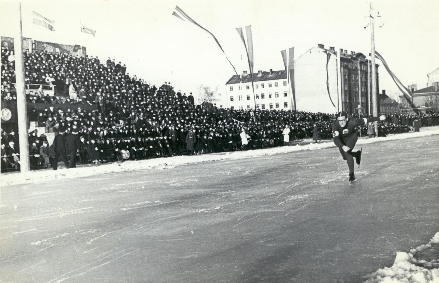 Alfons Bērziņš distancē 40. Eiropas meistarsacīkstēs ātrslidošanā Armijas sporta kluba laukumā Rīgā, 1939. gads.
