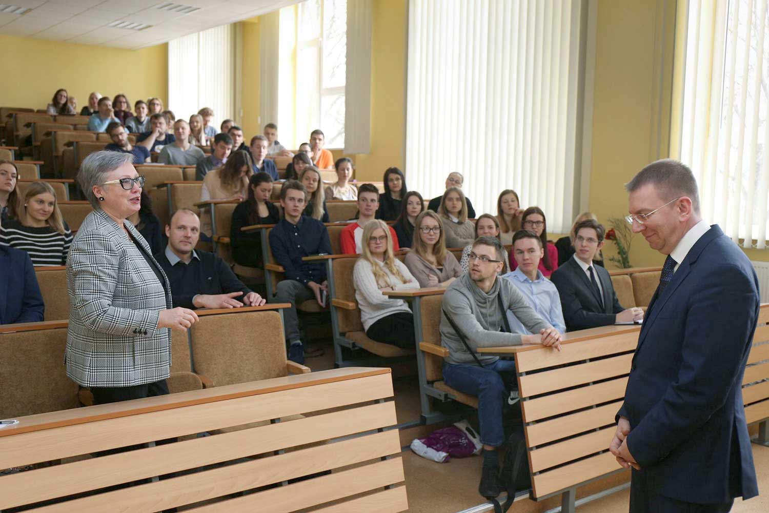 Profesore Žaneta Ozoliņa diskutē ar ārlietu ministru Edgaru Rinkeviču vieslekcijā par starptautiskās politikas un Latvijas ārpolitikas aktualitātēm. Latvijas Universitātes Sociālo zinātņu fakultāte, Rīga, 29.02.2016.