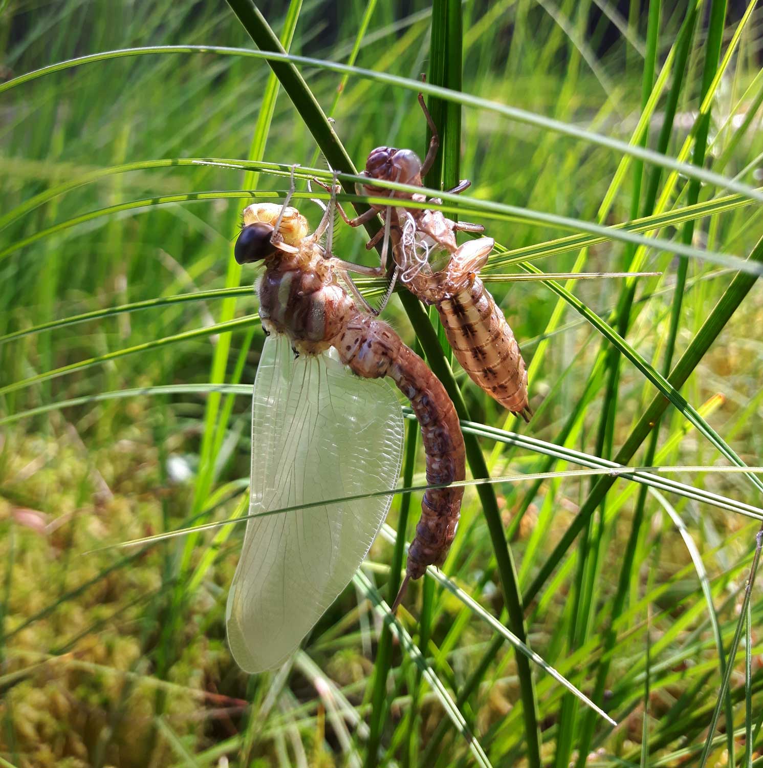Dažādspārnu (Anisoptera) spāres, dižspāres (Aeshnidae) kāpura āda jeb eksuvijs un tikko no tā izlīdusi spāre. Latviešu Viraudas apkārtne, Mākoņkalna pagasts, 16.07.2016.
