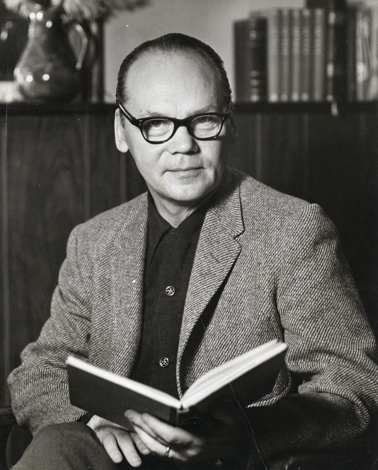 Valdemārs Kārkliņš ar atvērtu grāmatu rokās. ASV, 20. gs. 50.–60. gadi.