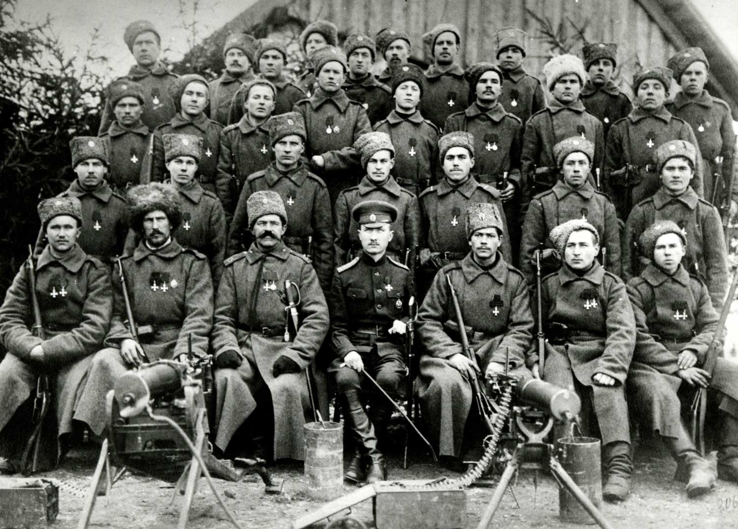 1. Daugavgrīvas latviešu strēlnieku bataljona 1. rotas strēlnieki – Sv. Jura apbalvojumu kavalieri. 1916. gads.